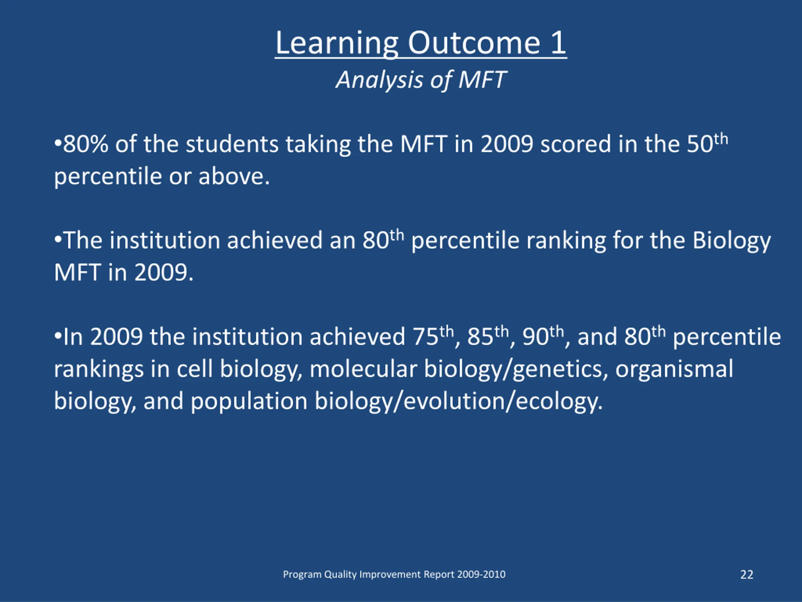 Learning Outcome 1 Analysis of MFT 80% of the students taking the MFT in 2009 scored in the 50th percentile or above. The institution achieved an 80th percentile ranking for the Biology MFT in 2009. In 2009 the institution achieved 75th, 85th, 90th, and 80th percentile rankings in cell biology, molecular biology/genetics, organismal biology, and population biology/evolution/ecology. 22 Program Quality Improvement Report 2009-2010