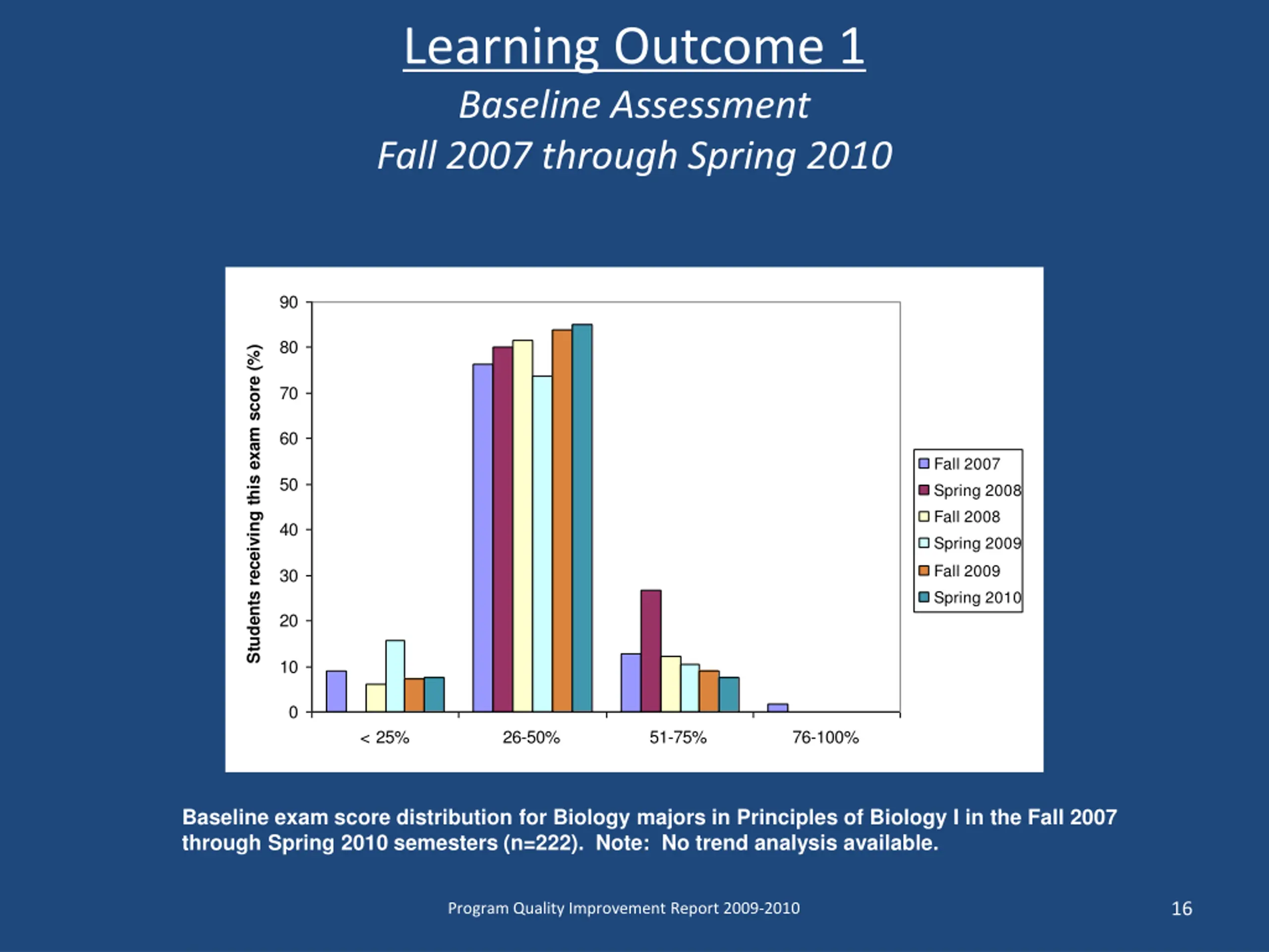Learning Outcome 1 Baseline Assessment Fall 2007 through Spring 2010 90 80 Students receiving this exam score (%) 70 60 Fall 2007 Spring 2008 Fall 2008 Spring 2009 50 40 Fall 2009 Spring 2010 30 20 10 0 < 25% 26-50% 51-75% 76-100% Baseline exam score distribution for Biology majors in Principles of Biology I in the Fall 2007 through Spring 2010 semesters (n=222). Note: No trend analysis available. 16 Program Quality Improvement Report 2009-2010