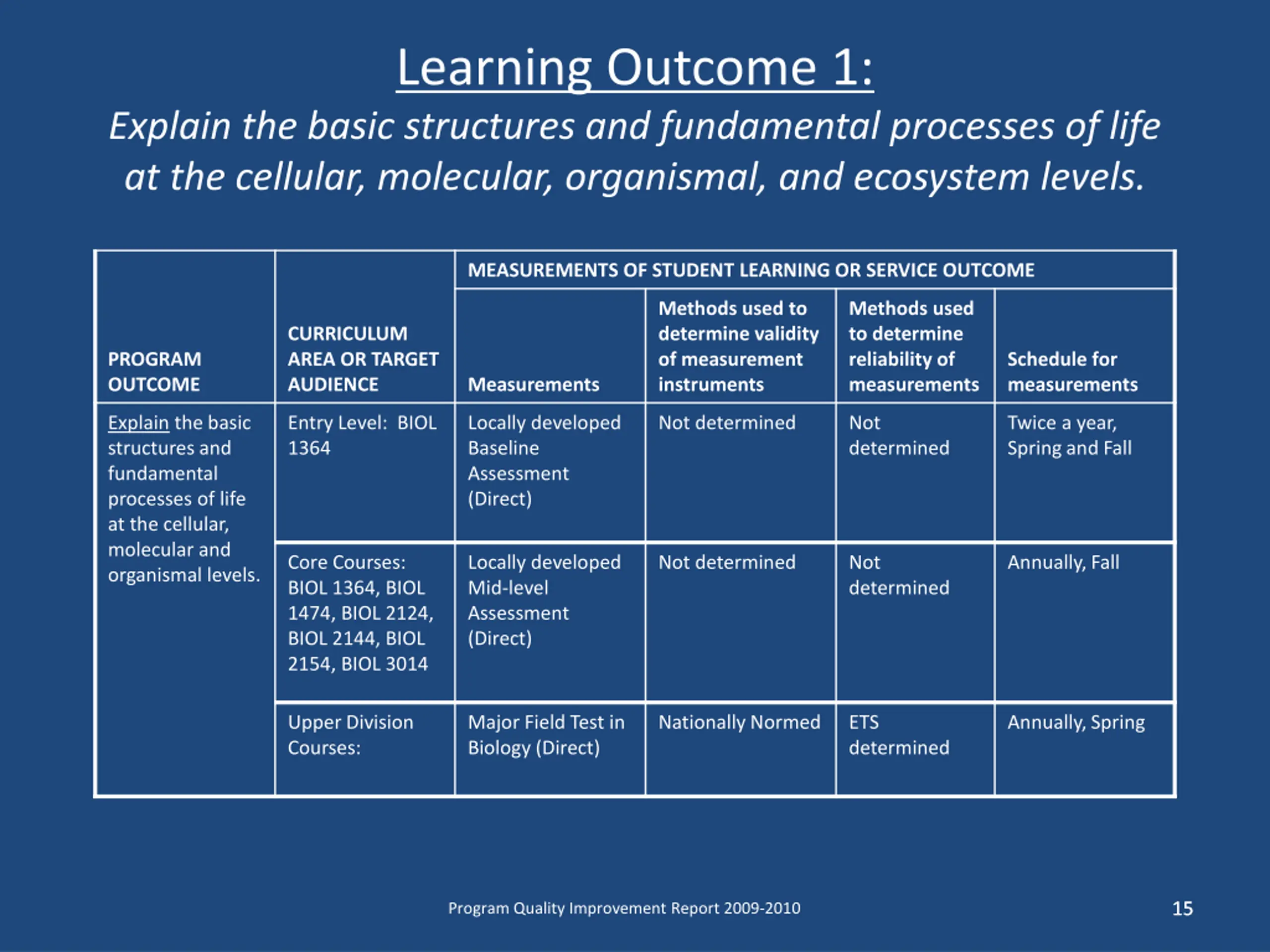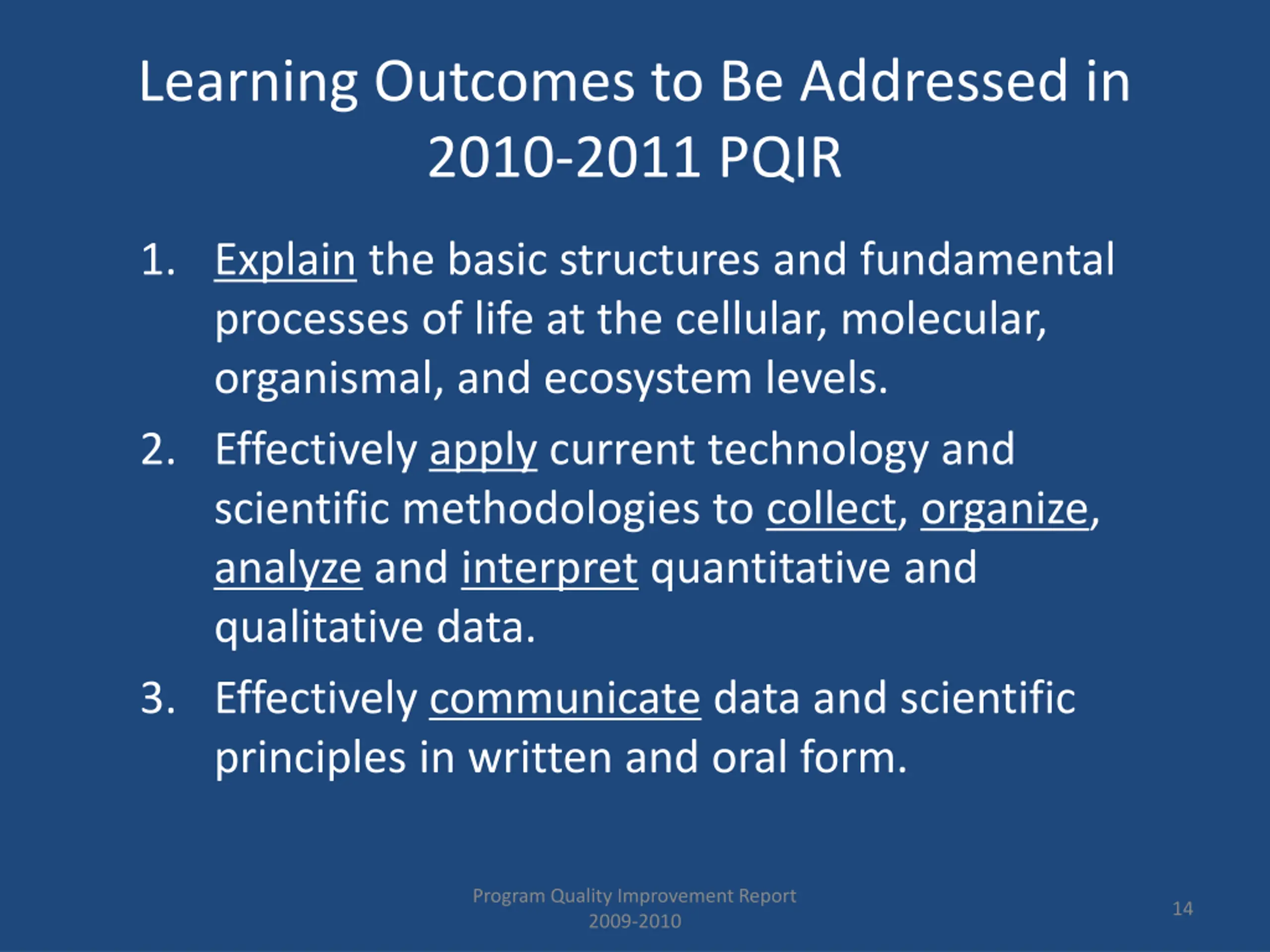 Learning Outcomes to Be Addressed in 2010-2011 PQIR 1. Explain the basic structures and fundamental processes of life at the cellular, molecular, organismal, and ecosystem levels. 2. Effectively apply current technology and scientific methodologies to collect, organize, analyze and interpret quantitative and qualitative data. 3. Effectively communicate data and scientific principles in written and oral form. Program Quality Improvement Report 2009-2010 14