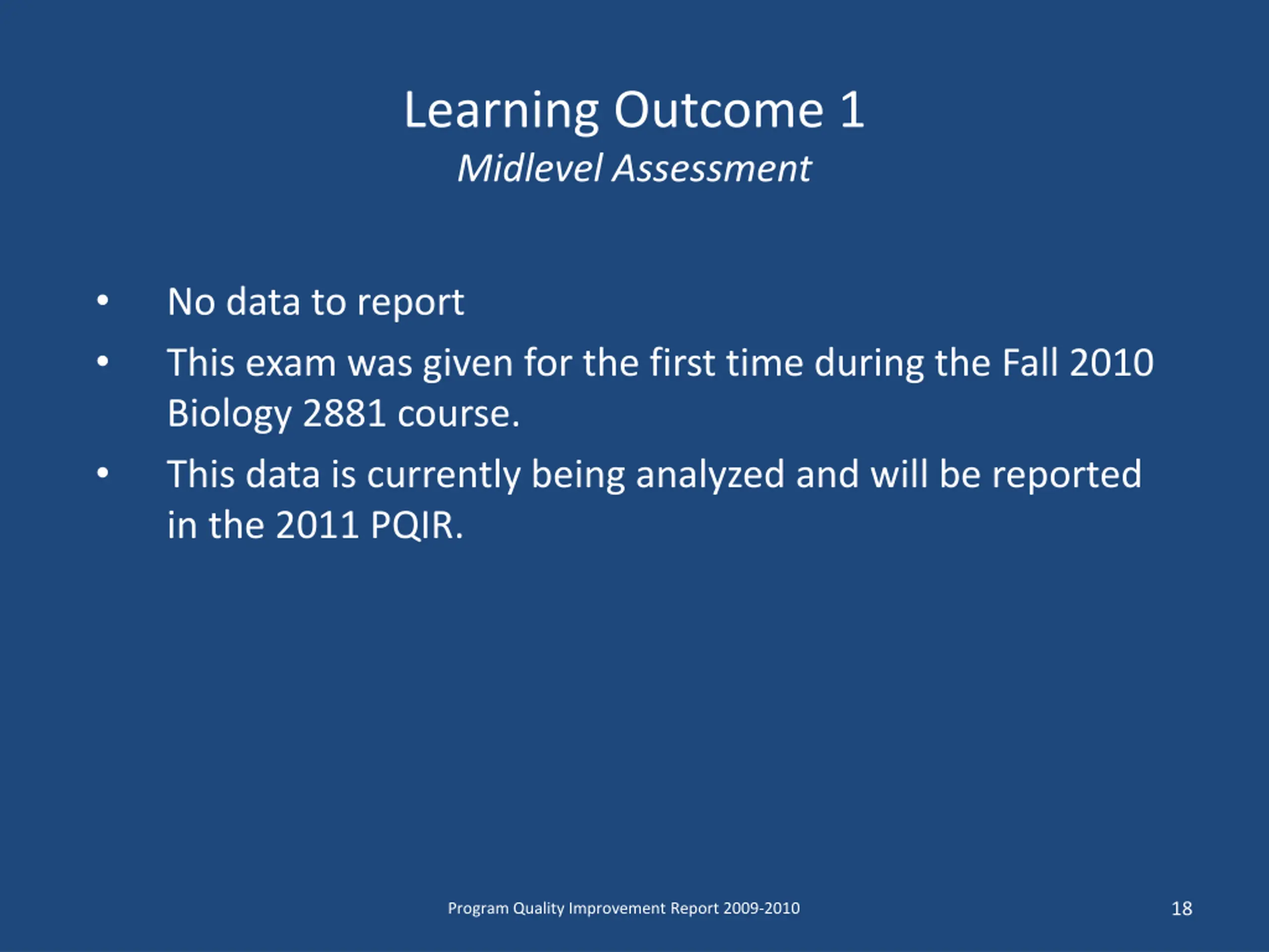 Learning Outcome 1 Midlevel Assessment No data to report This exam was given for the first time during the Fall 2010 Biology 2881 course. This data is currently being analyzed and will be reported in the 2011 PQIR. 18 Program Quality Improvement Report 2009-2010