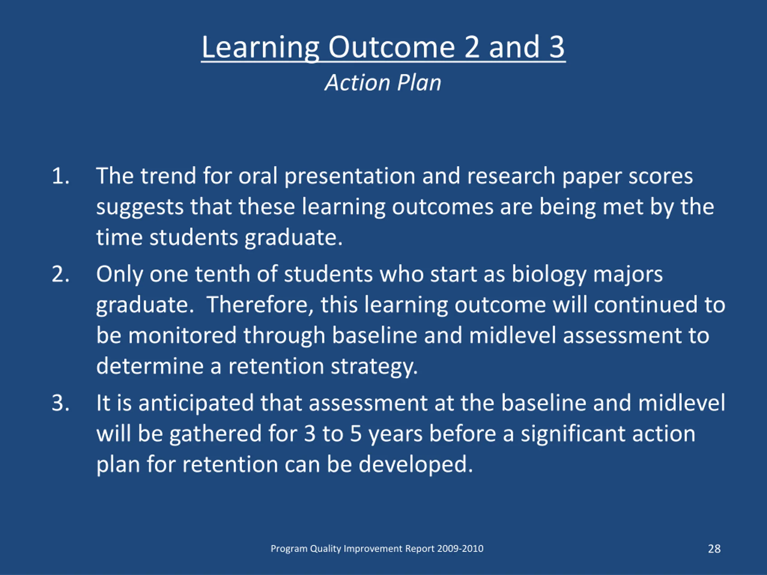 Learning Outcome 2 and 3 Action Plan 1. The trend for oral presentation and research paper scores suggests that these learning outcomes are being met by the time students graduate. Only one tenth of students who start as biology majors graduate. Therefore, this learning outcome will continued to be monitored through baseline and midlevel assessment to determine a retention strategy. It is anticipated that assessment at the baseline and midlevel will be gathered for 3 to 5 years before a significant action plan for retention can be developed. 2. 3. 28 Program Quality Improvement Report 2009-2010