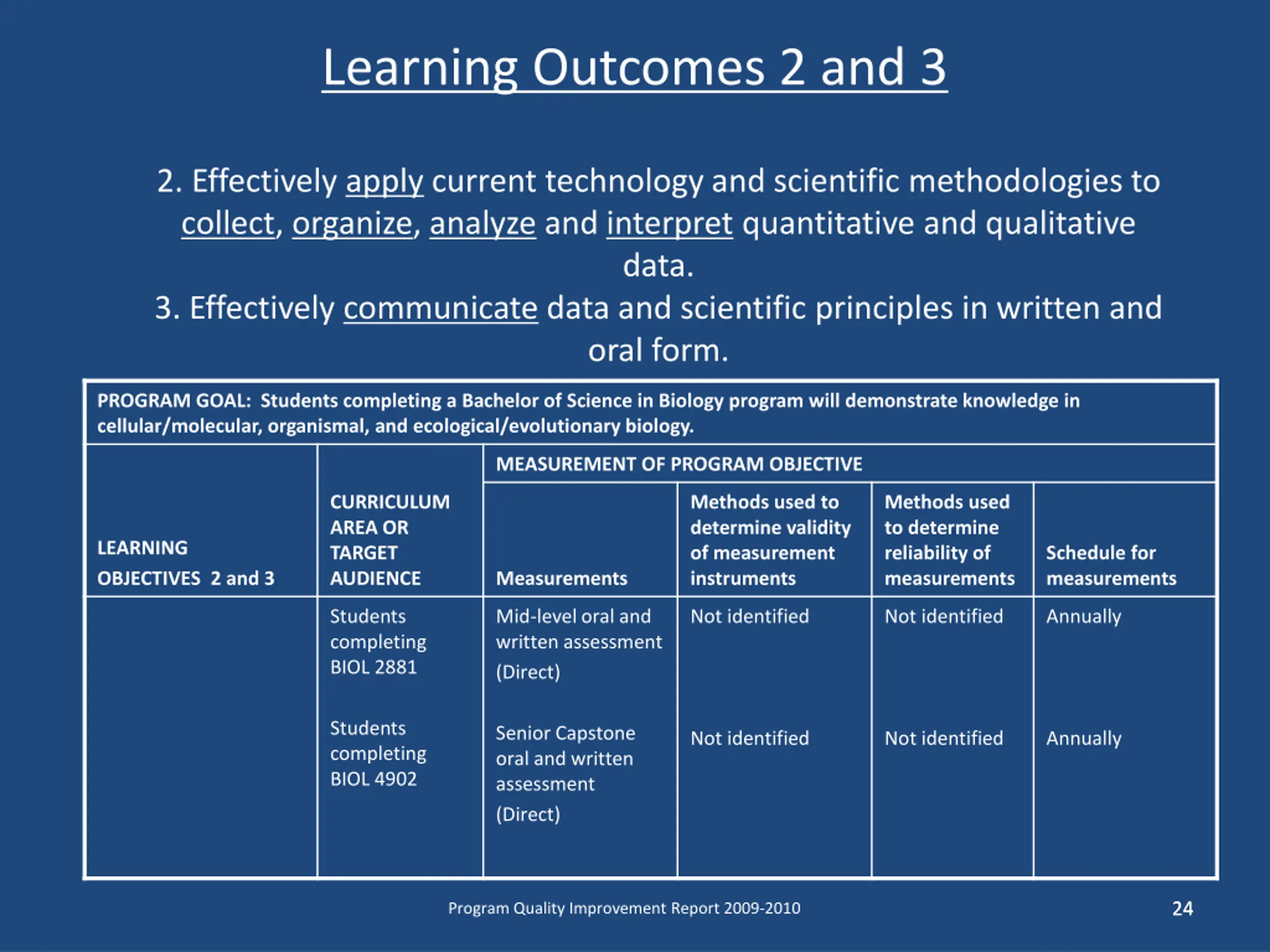 Learning Outcomes 2 and 3 2. Effectively apply current technology and scientific methodologies to collect, organize, analyze and interpret quantitative and qualitative data. 3. Effectively communicate data and scientific principles in written and oral form. PROGRAM GOAL: Students completing a Bachelor of Science in Biology program will demonstrate knowledge in cellular/molecular, organismal, and ecological/evolutionary biology. MEASUREMENT OF PROGRAM OBJECTIVE CURRICULUM AREA OR TARGET AUDIENCE Methods used to determine validity of measurement instruments Methods used to determine reliability of measurements LEARNING OBJECTIVES 2 and 3 Schedule for measurements Measurements Students completing BIOL 2881 Mid-level oral and written assessment (Direct) Not identified Not identified Annually Students completing BIOL 4902 Senior Capstone oral and written assessment (Direct) Not identified Not identified Annually 24 24 Program Quality Improvement Report 2009-2010