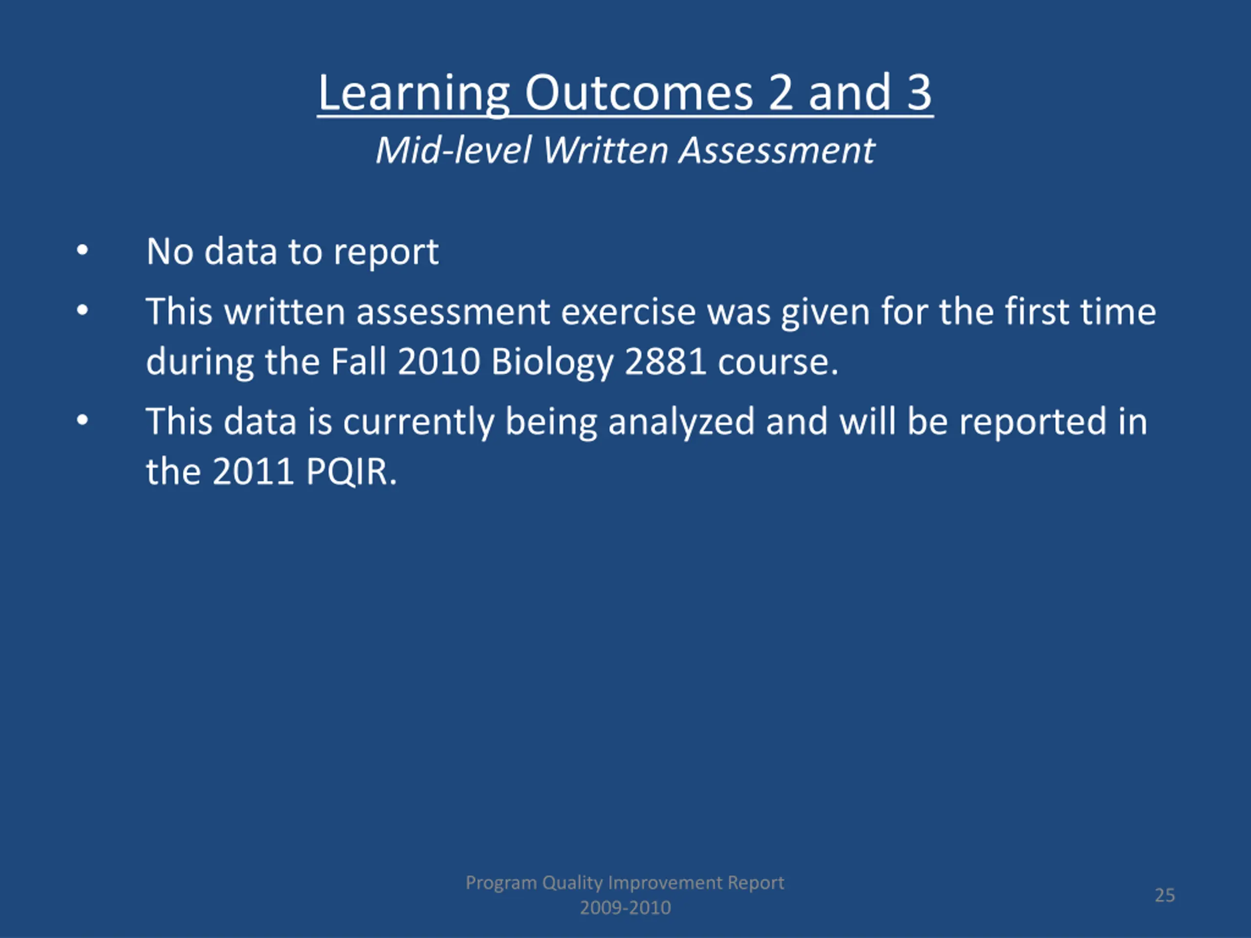 Learning Outcomes 2 and 3 Mid-level Written Assessment No data to report This written assessment exercise was given for the first time during the Fall 2010 Biology 2881 course. This data is currently being analyzed and will be reported in the 2011 PQIR. Program Quality Improvement Report 2009-2010 25