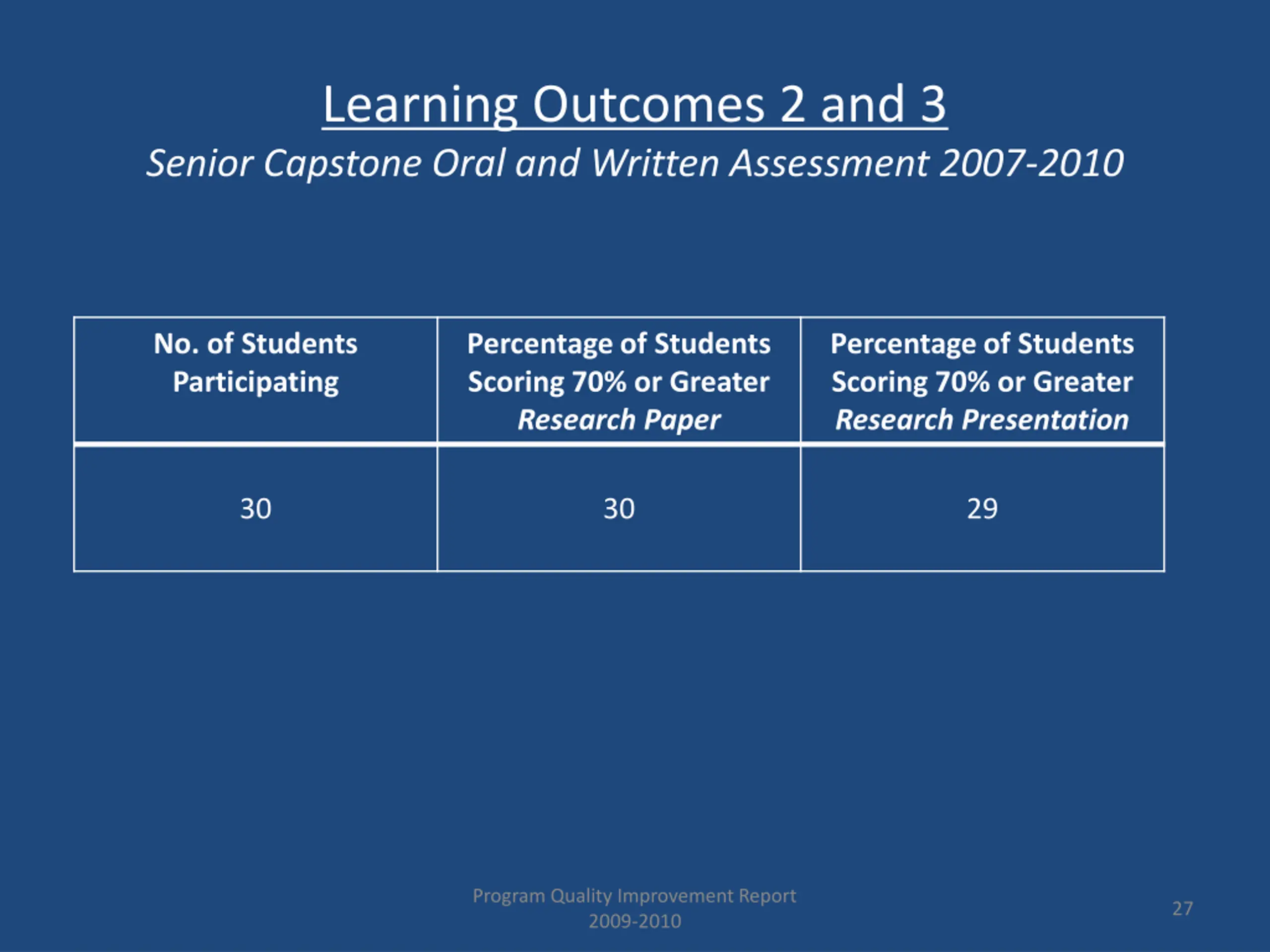 Learning Outcomes 2 and 3 Senior Capstone Oral and Written Assessment 2007-2010 No. of Students Participating Percentage of Students Scoring 70% or Greater Research Paper Percentage of Students Scoring 70% or Greater Research Presentation 30 30 29 Program Quality Improvement Report 2009-2010 27