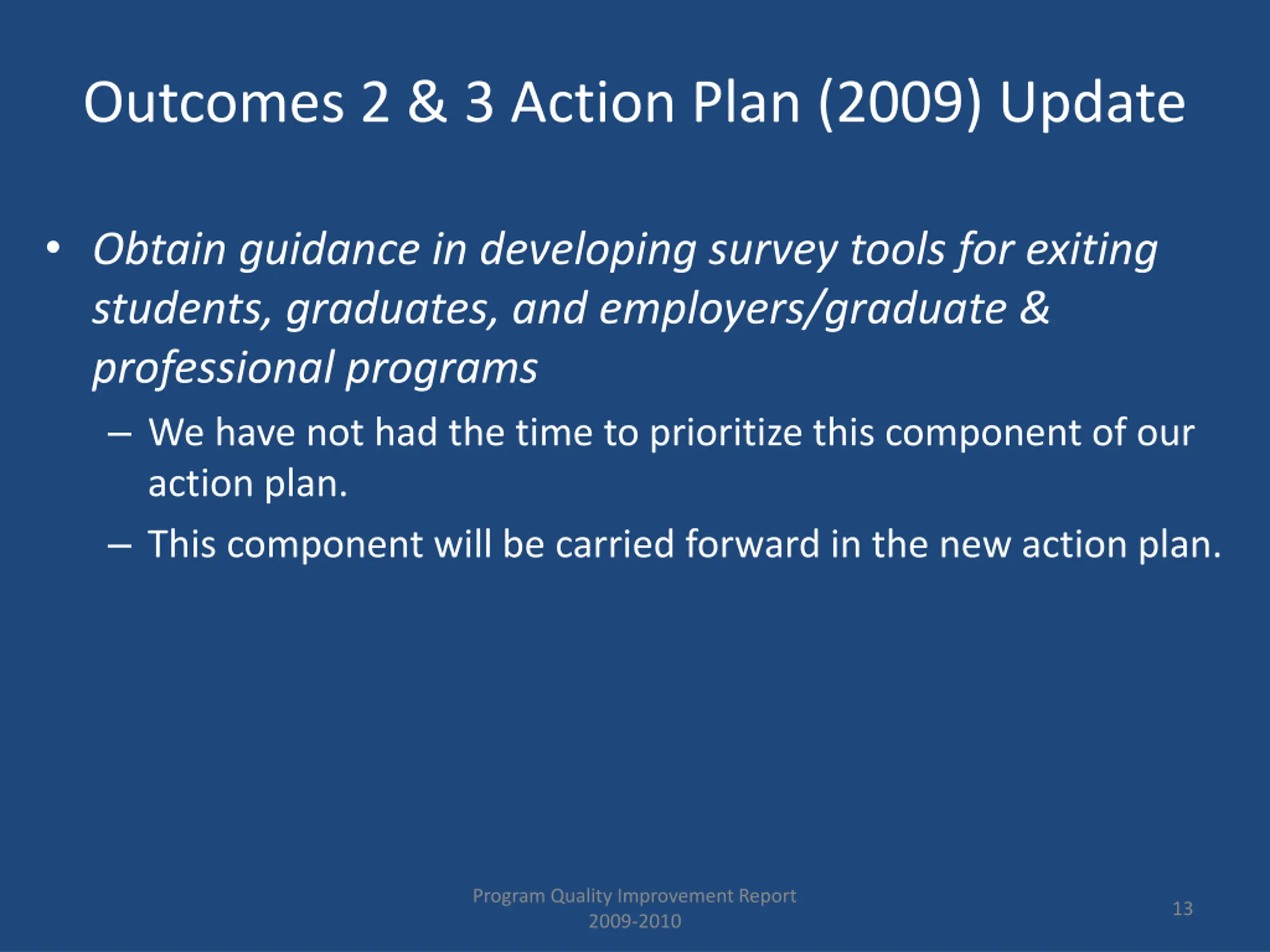 Outcomes 2 & 3 Action Plan (2009) Update Obtain guidance in developing survey tools for exiting students, graduates, and employers/graduate & professional programs We have not had the time to prioritize this component of our action plan. This component will be carried forward in the new action plan. Program Quality Improvement Report 2009-2010 13