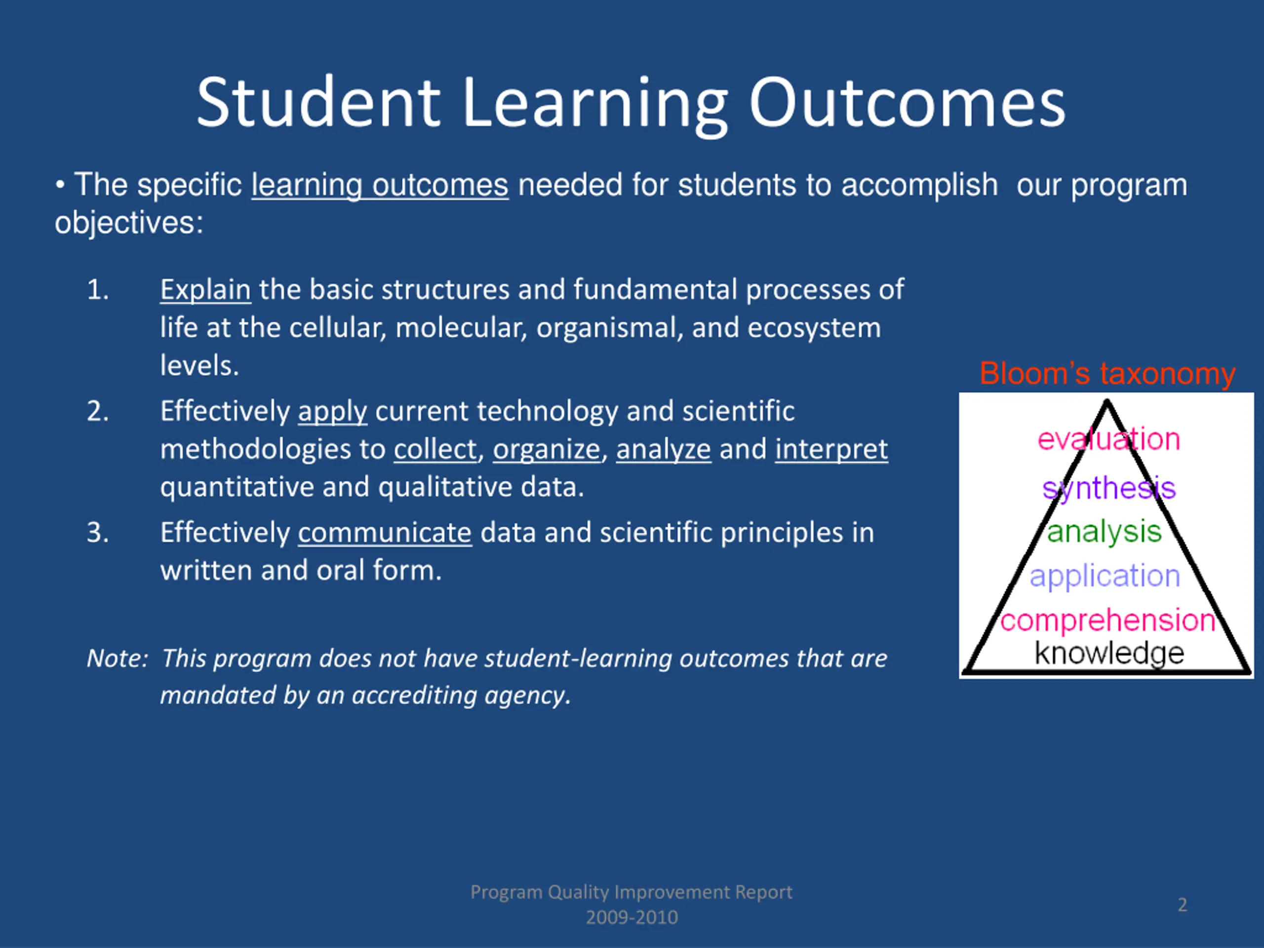 Student Learning Outcomes The specific learning outcomes needed for students to accomplish our program objectives: 1. Explain the basic structures and fundamental processes of life at the cellular, molecular, organismal, and ecosystem levels. Effectively apply current technology and scientific methodologies to collect, organize, analyze and interpret quantitative and qualitative data. Effectively communicate data and scientific principles in written and oral form. Bloom s taxonomy 2. 3. Note: This program does not have student-learning outcomes that are mandated by an accrediting agency. Program Quality Improvement Report 2009-2010 2