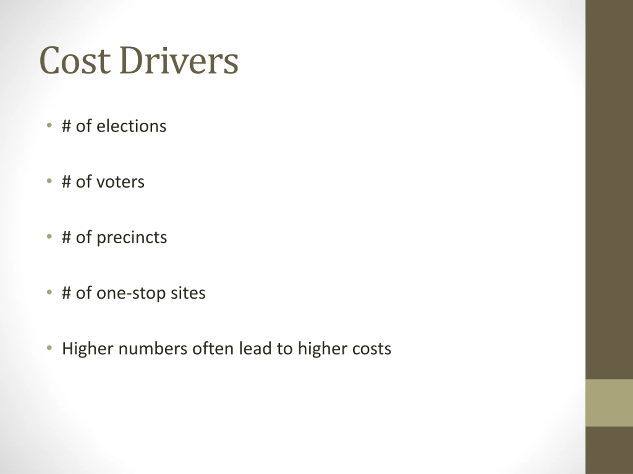 Cost Drivers # of elections # of voters # of precincts # of one-stop sites Higher numbers often lead to higher costs