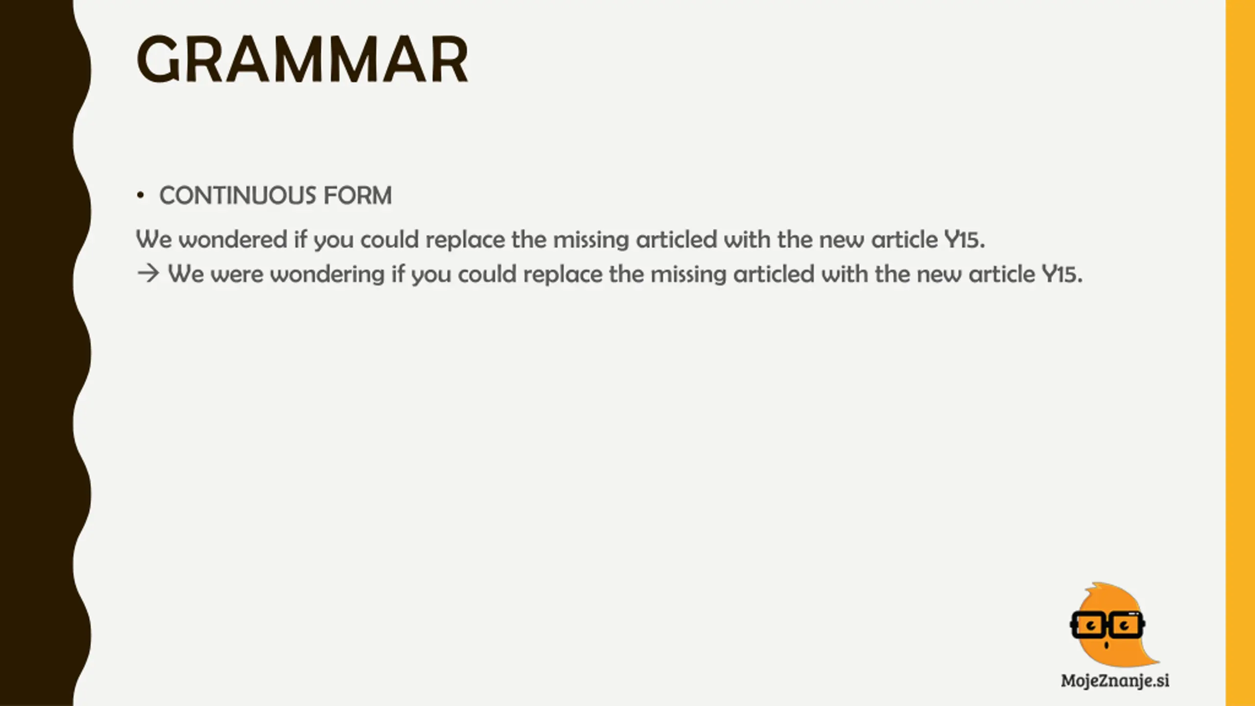 GRAMMAR CONTINUOUS FORM We wondered if you could replace the missing articled with the new article Y15. We were wondering if you could replace the missing articled with the new article Y15.