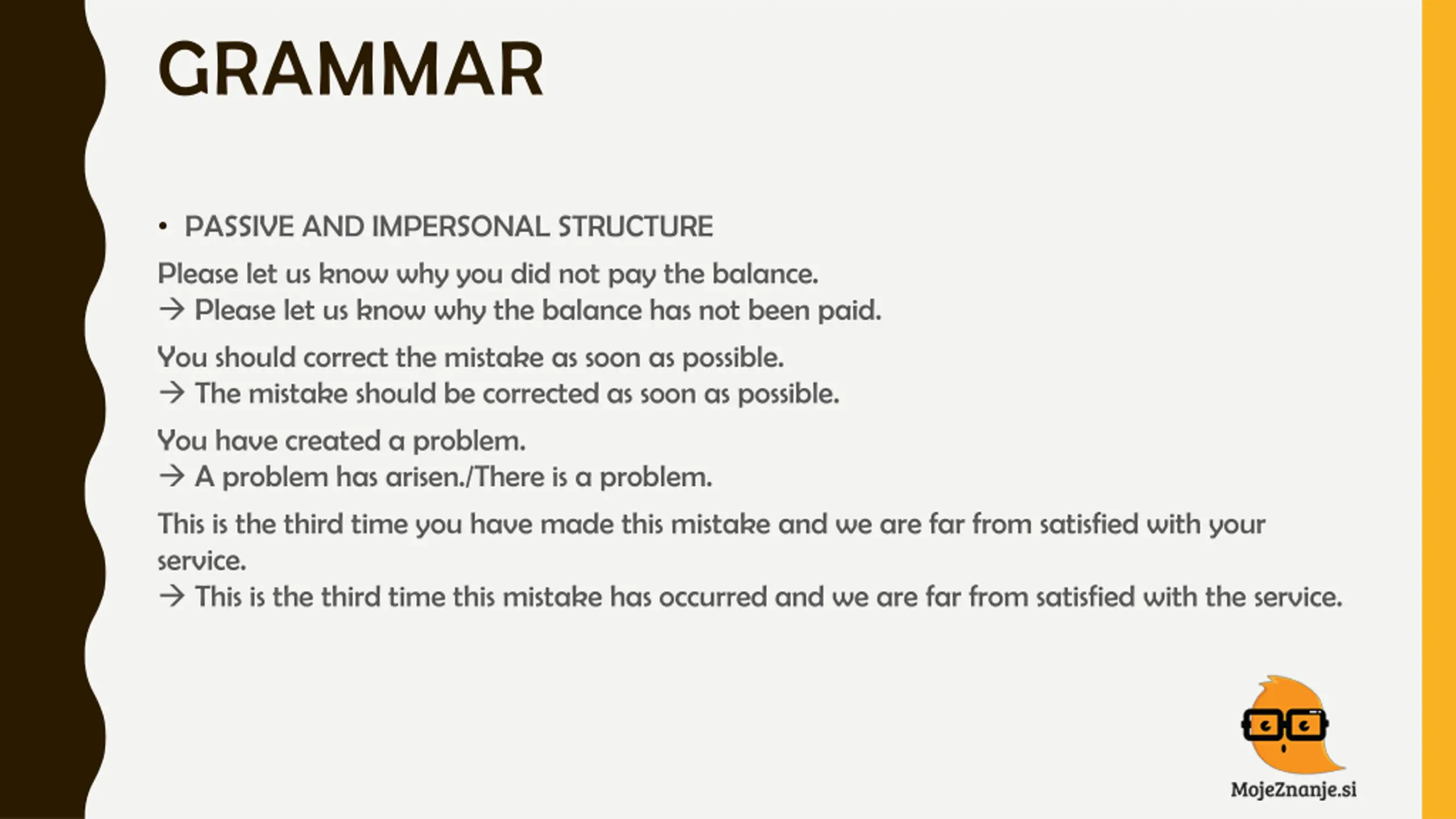 GRAMMAR PASSIVE AND IMPERSONAL STRUCTURE Please let us know why you did not pay the balance. Please let us know why the balance has not been paid. You should correct the mistake as soon as possible. The mistake should be corrected as soon as possible. You have created a problem. A problem has arisen./There is a problem. This is the third time you have made this mistake and we are far from satisfied with your service. This is the third time this mistake has occurred and we are far from satisfied with the service.