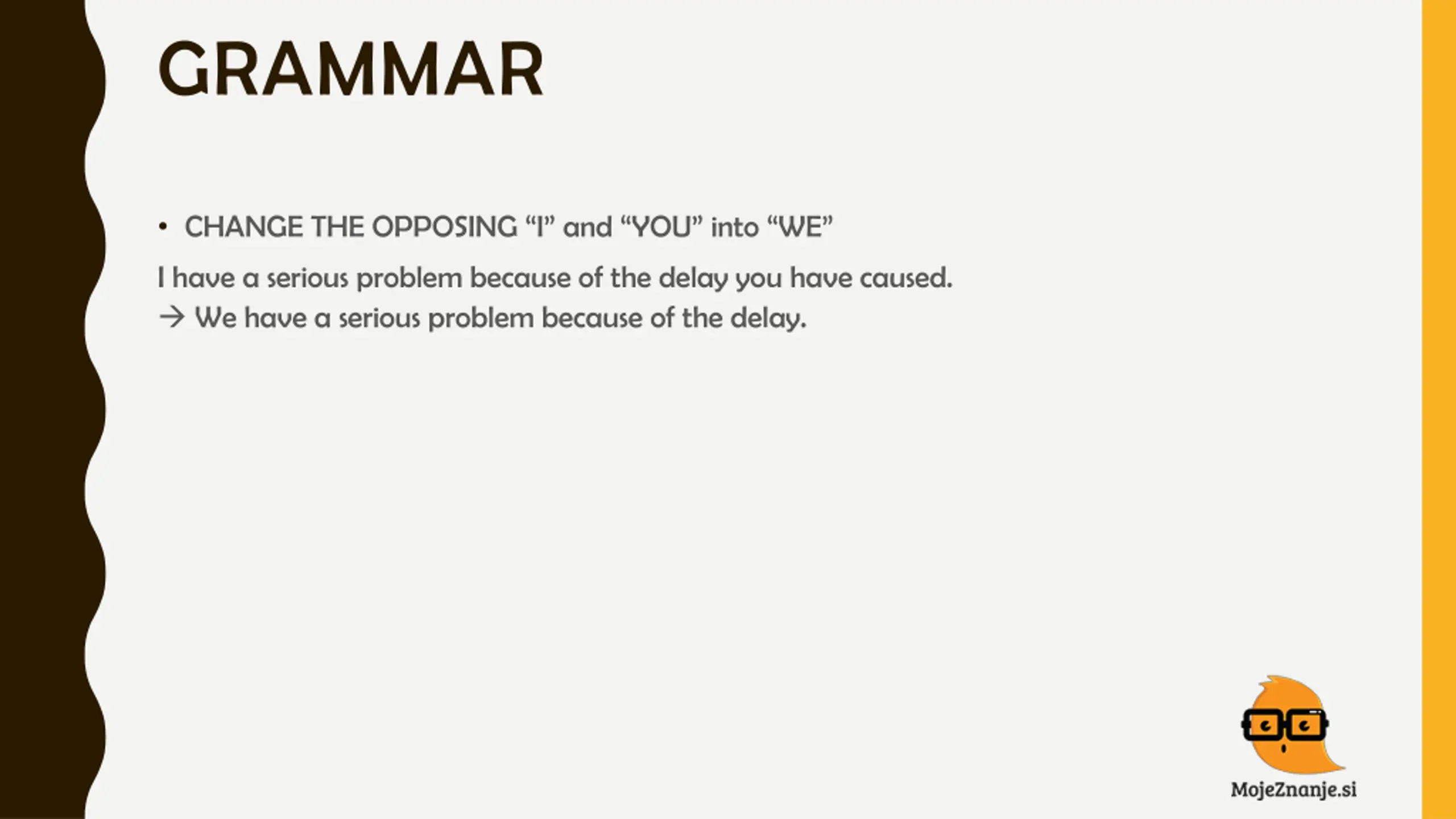 GRAMMAR CHANGE THE OPPOSING I and YOU into WE I have a serious problem because of the delay you have caused. We have a serious problem because of the delay.