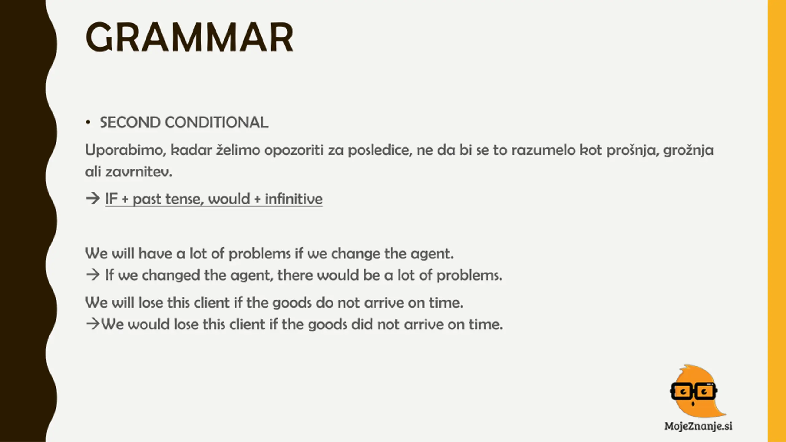 GRAMMAR SECOND CONDITIONAL Uporabimo, kadar elimo opozoriti za posledice, ne da bi se to razumelo kot pro nja, gro nja ali zavrnitev. IF + past tense, would + infinitive We will have a lot of problems if we change the agent. If we changed the agent, there would be a lot of problems. We will lose this client if the goods do not arrive on time. We would lose this client if the goods did not arrive on time.
