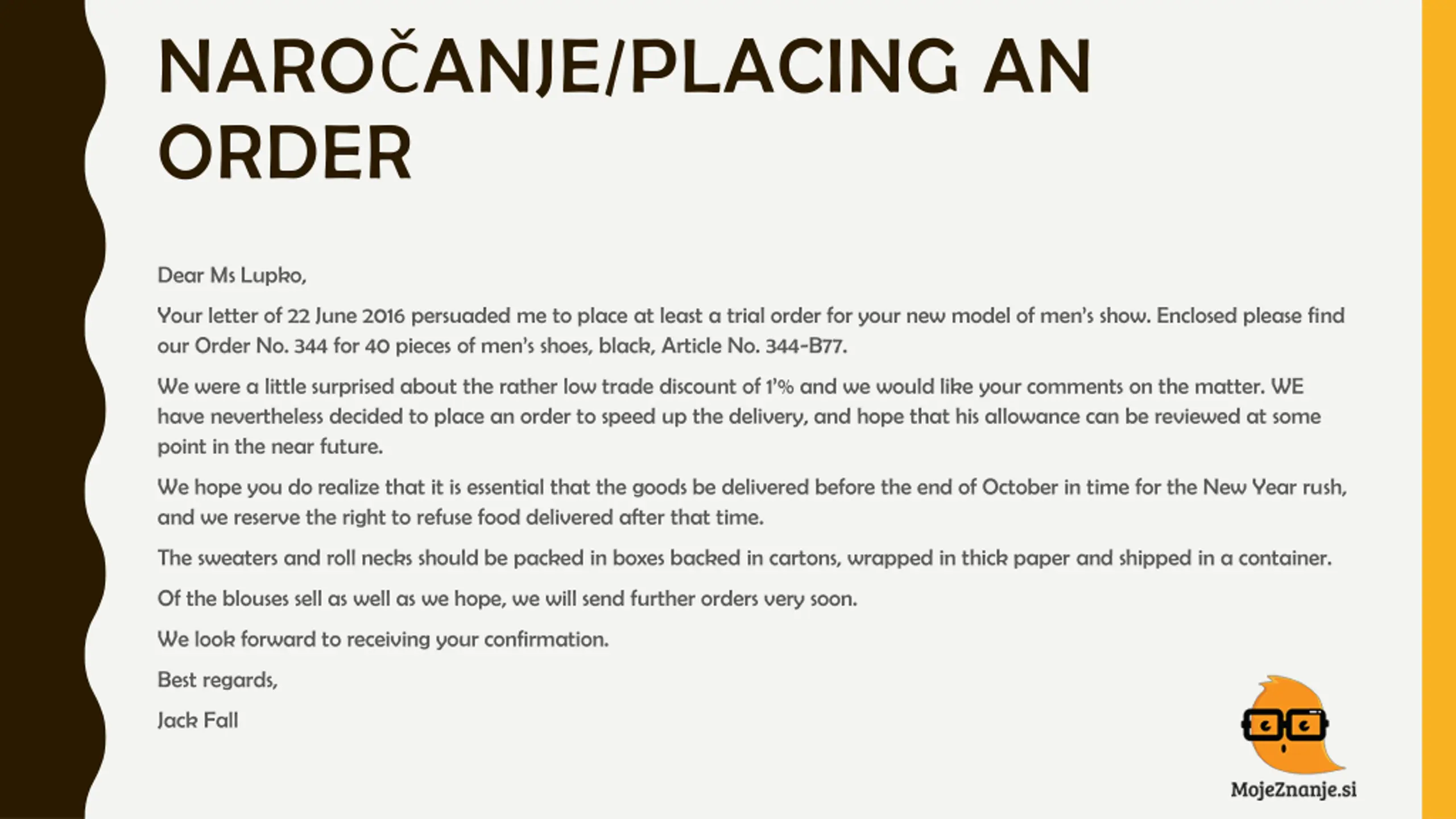 NAROANJE/PLACING AN ORDER Dear Ms Lupko, Your letter of 22 June 2016 persuaded me to place at least a trial order for your new model of men s show. Enclosed please find our Order No. 344 for 40 pieces of men s shoes, black, Article No. 344-B77. We were a little surprised about the rather low trade discount of 1 % and we would like your comments on the matter. WE have nevertheless decided to place an order to speed up the delivery, and hope that his allowance can be reviewed at some point in the near future. We hope you do realize that it is essential that the goods be delivered before the end of October in time for the New Year rush, and we reserve the right to refuse food delivered after that time. The sweaters and roll necks should be packed in boxes backed in cartons, wrapped in thick paper and shipped in a container. Of the blouses sell as well as we hope, we will send further orders very soon. We look forward to receiving your confirmation. Best regards, Jack Fall
