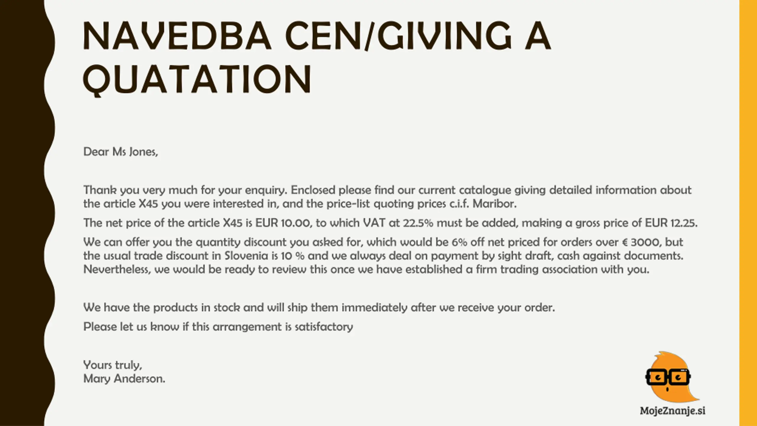 NAVEDBA CEN/GIVING A QUATATION Dear Ms Jones, Thank you very much for your enquiry. Enclosed please find our current catalogue giving detailed information about the article X45 you were interested in, and the price-list quoting prices c.i.f. Maribor. The net price of the article X45 is EUR 10.00, to which VAT at 22.5% must be added, making a gross price of EUR 12.25. We can offer you the quantity discount you asked for, which would be 6% off net priced for orders over 3000, but the usual trade discount in Slovenia is 10 % and we always deal on payment by sight draft, cash against documents. Nevertheless, we would be ready to review this once we have established a firm trading association with you. We have the products in stock and will ship them immediately after we receive your order. Please let us know if this arrangement is satisfactory Yours truly, Mary Anderson.