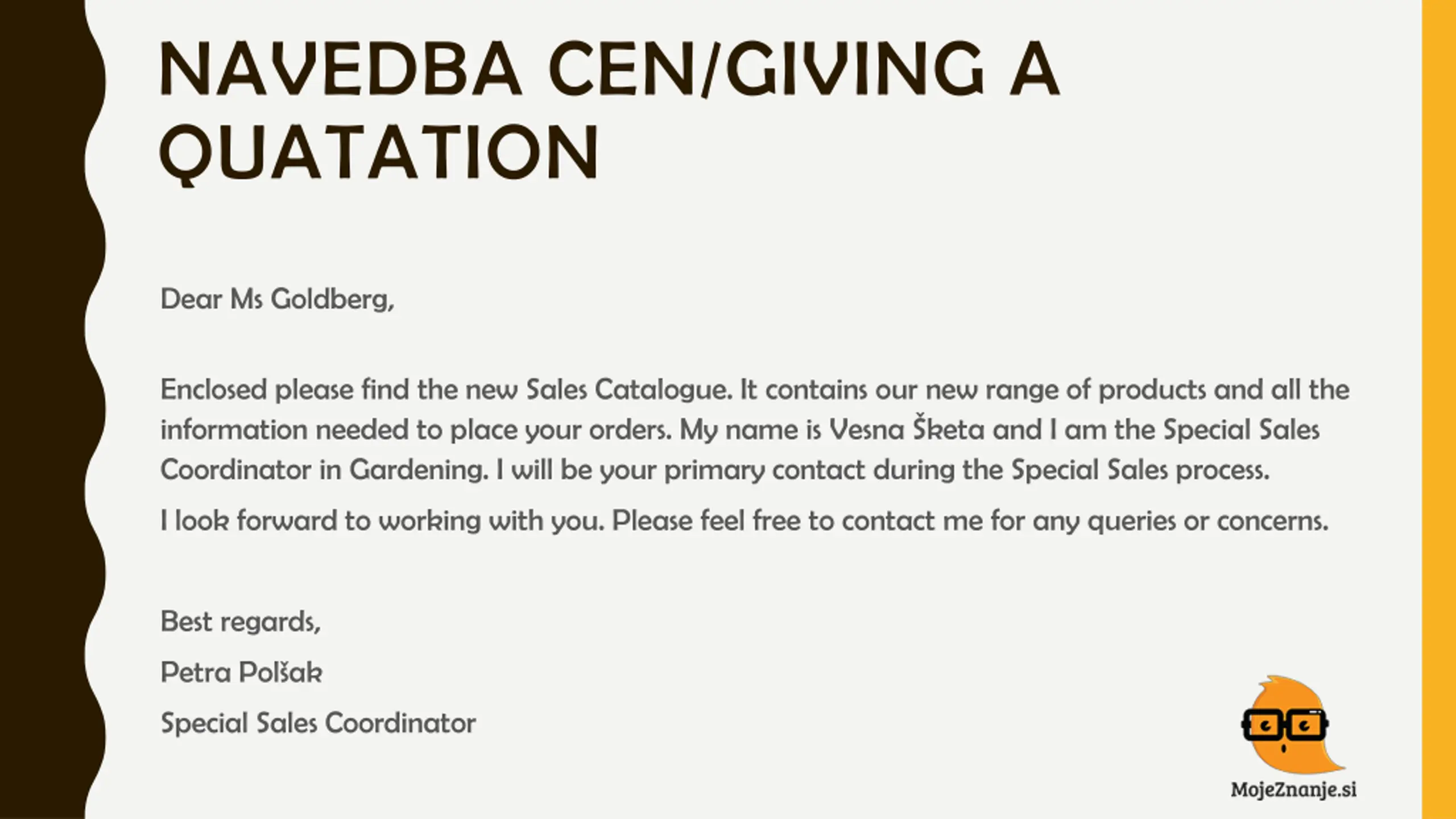 NAVEDBA CEN/GIVING A QUATATION Dear Ms Goldberg, Enclosed please find the new Sales Catalogue. It contains our new range of products and all the information needed to place your orders. My name is Vesna keta and I am the Special Sales Coordinator in Gardening. I will be your primary contact during the Special Sales process. I look forward to working with you. Please feel free to contact me for any queries or concerns. Best regards, Petra Pol ak Special Sales Coordinator
