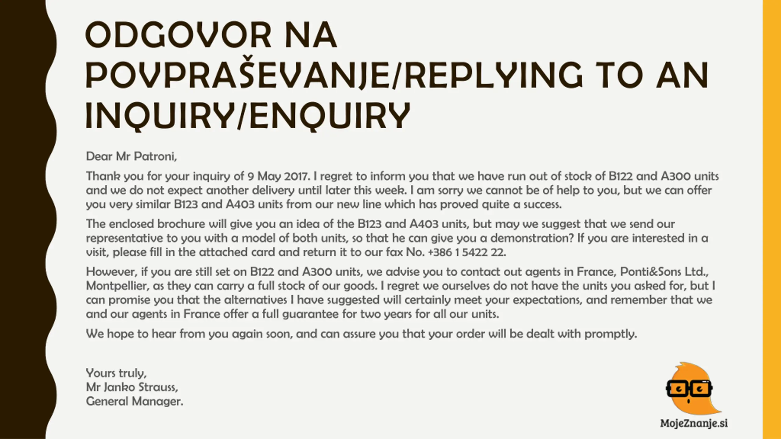 ODGOVOR NA POVPRA EVANJE/REPLYING TO AN INQUIRY/ENQUIRY Dear Mr Patroni, Thank you for your inquiry of 9 May 2017. I regret to inform you that we have run out of stock of B122 and A300 units and we do not expect another delivery until later this week. I am sorry we cannot be of help to you, but we can offer you very similar B123 and A403 units from our new line which has proved quite a success. The enclosed brochure will give you an idea of the B123 and A403 units, but may we suggest that we send our representative to you with a model of both units, so that he can give you a demonstration? If you are interested in a visit, please fill in the attached card and return it to our fax No. +386 1 5422 22. However, if you are still set on B122 and A300 units, we advise you to contact out agents in France, Ponti&Sons Ltd., Montpellier, as they can carry a full stock of our goods. I regret we ourselves do not have the units you asked for, but I can promise you that the alternatives I have suggested will certainly meet your expectations, and remember that we and our agents in France offer a full guarantee for two years for all our units. We hope to hear from you again soon, and can assure you that your order will be dealt with promptly. Yours truly, Mr Janko Strauss, General Manager.