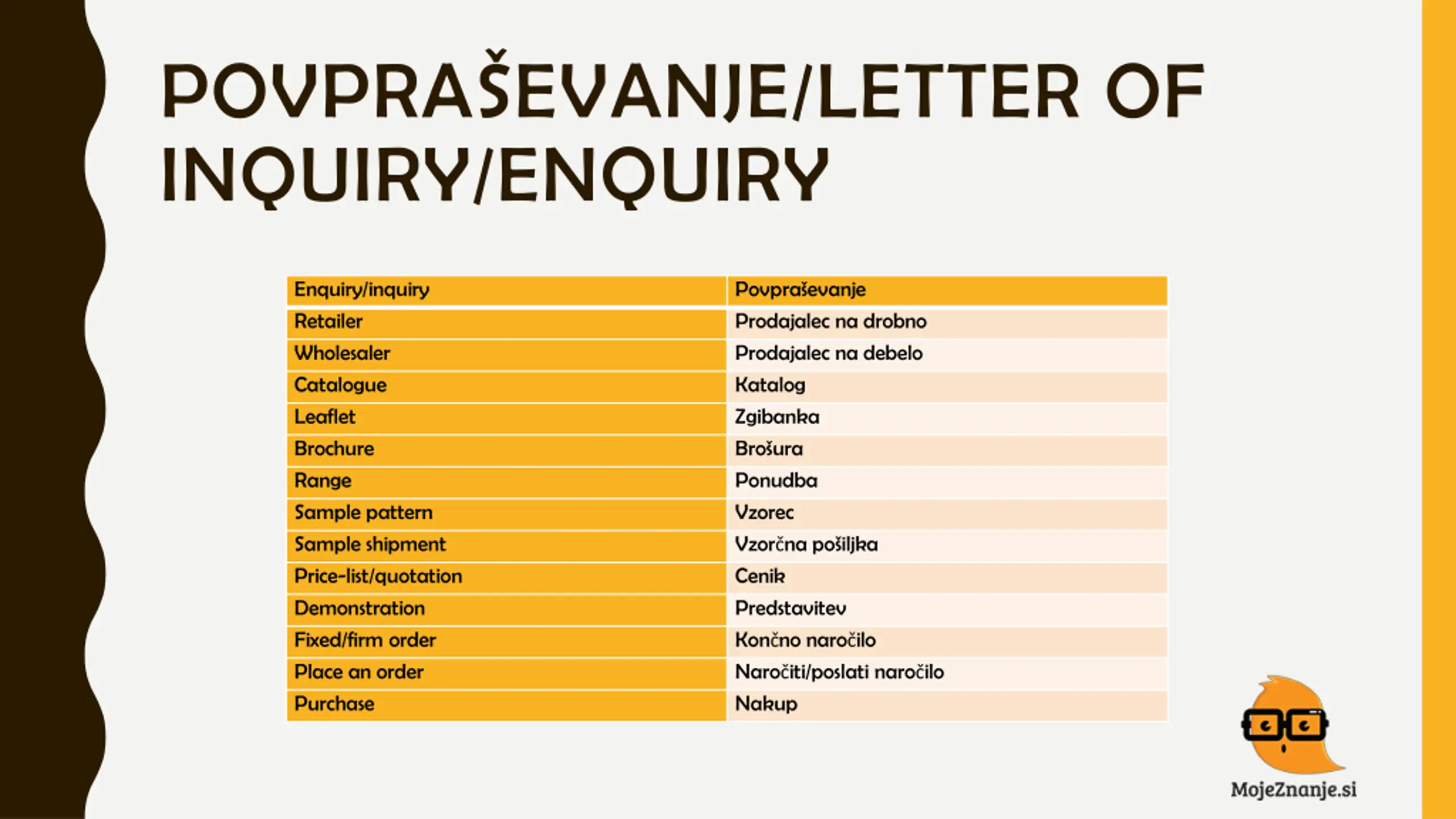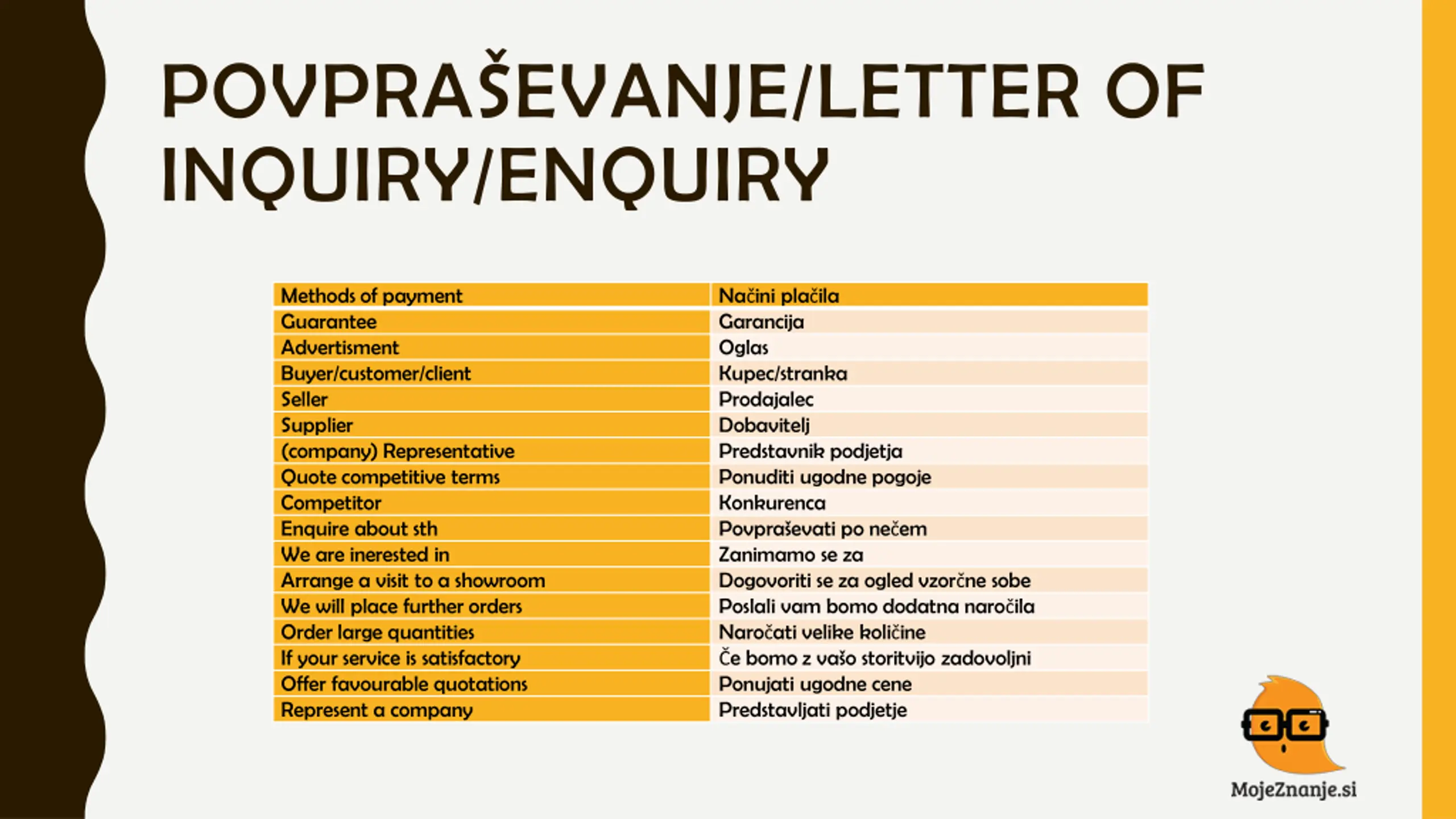 POVPRAEVANJE/LETTER OF INQUIRY/ENQUIRY Methods of payment Guarantee Advertisment Buyer/customer/client Seller Supplier (company) Representative Quote competitive terms Competitor Enquire about sth We are inerested in Arrange a visit to a showroom We will place further orders Order large quantities If your service is satisfactory Offer favourable quotations Represent a company Na ini pla ila Garancija Oglas Kupec/stranka Prodajalec Dobavitelj Predstavnik podjetja Ponuditi ugodne pogoje Konkurenca Povpra evati po ne em Zanimamo se za Dogovoriti se za ogled vzor ne sobe Poslali vam bomo dodatna naro ila Naro ati velike koli ine e bomo z va o storitvijo zadovoljni Ponujati ugodne cene Predstavljati podjetje