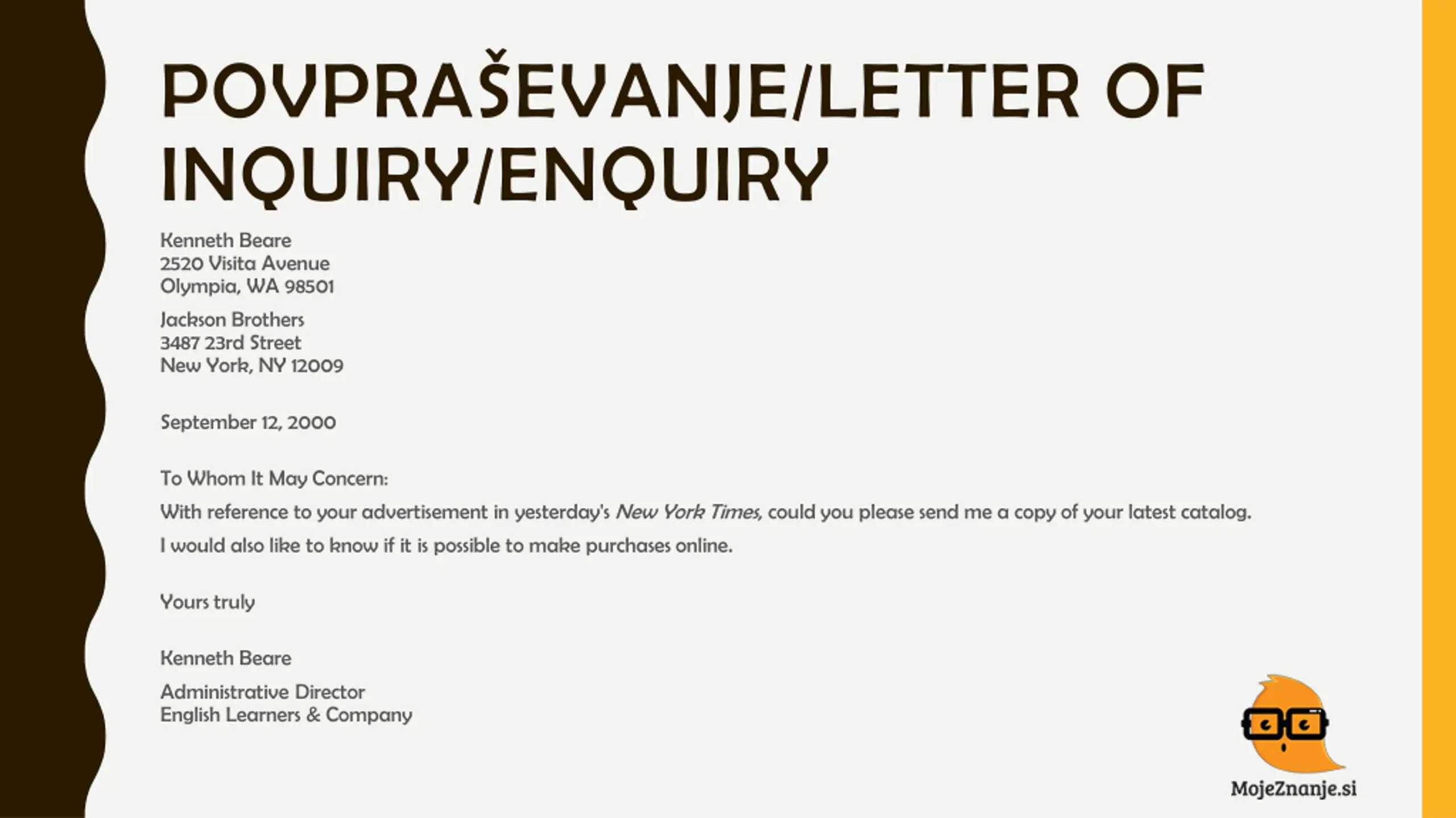 POVPRAEVANJE/LETTER OF INQUIRY/ENQUIRY Kenneth Beare 2520 Visita Avenue Olympia, WA 98501 Jackson Brothers 3487 23rd Street New York, NY 12009 September 12, 2000 To Whom It May Concern: With reference to your advertisement in yesterday's New York Times, could you please send me a copy of your latest catalog. I would also like to know if it is possible to make purchases online. Yours truly Kenneth Beare Administrative Director English Learners & Company