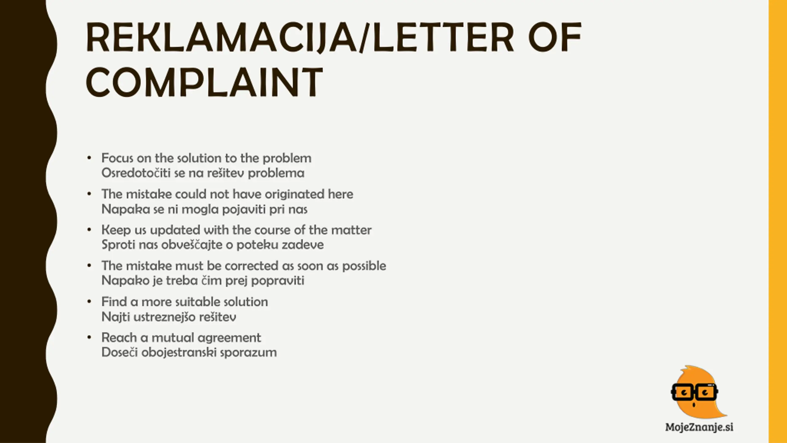 REKLAMACIJA/LETTER OF COMPLAINT Focus on the solution to the problem Osredoto iti se na re itev problema The mistake could not have originated here Napaka se ni mogla pojaviti pri nas Keep us updated with the course of the matter Sproti nas obve ajte o poteku zadeve The mistake must be corrected as soon as possible Napako je treba im prej popraviti Find a more suitable solution Najti ustreznej o re itev Reach a mutual agreement Dose i obojestranski sporazum