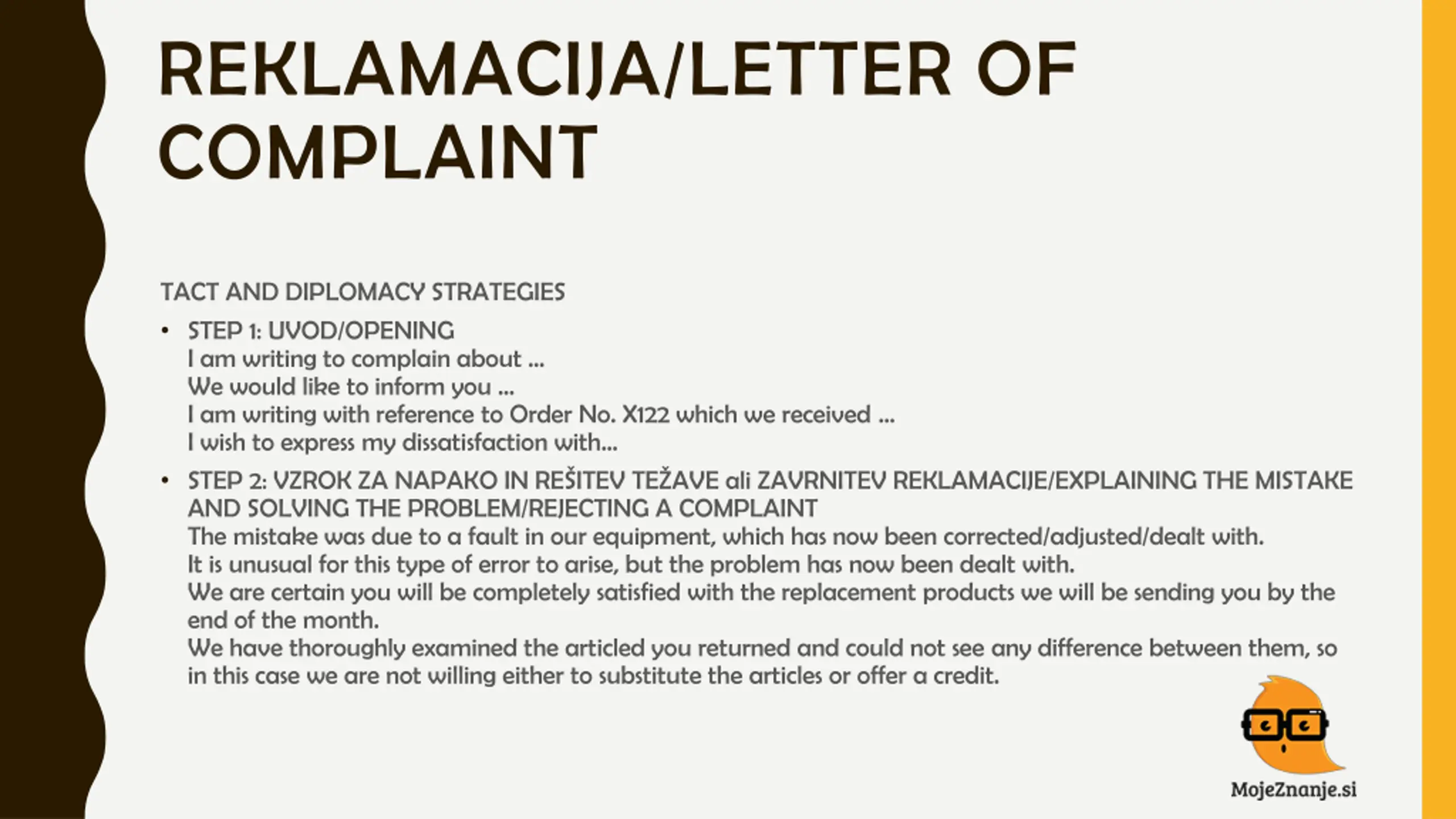 REKLAMACIJA/LETTER OF COMPLAINT TACT AND DIPLOMACY STRATEGIES STEP 1: UVOD/OPENING I am writing to complain about We would like to inform you I am writing with reference to Order No. X122 which we received I wish to express my dissatisfaction with STEP 2: VZROK ZA NAPAKO IN RE ITEV TE AVE ali ZAVRNITEV REKLAMACIJE/EXPLAINING THE MISTAKE AND SOLVING THE PROBLEM/REJECTING A COMPLAINT The mistake was due to a fault in our equipment, which has now been corrected/adjusted/dealt with. It is unusual for this type of error to arise, but the problem has now been dealt with. We are certain you will be completely satisfied with the replacement products we will be sending you by the end of the month. We have thoroughly examined the articled you returned and could not see any difference between them, so in this case we are not willing either to substitute the articles or offer a credit.