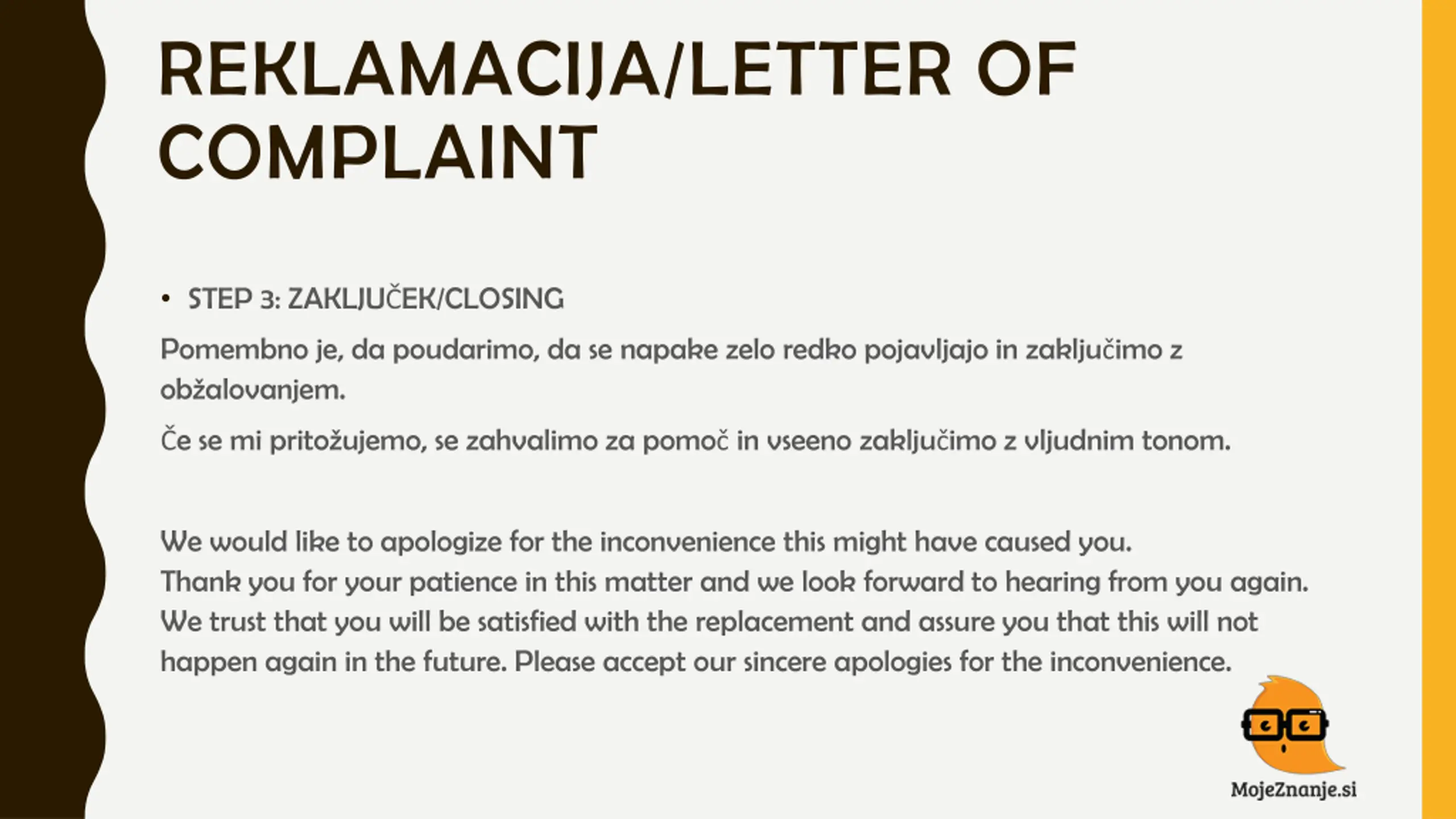 REKLAMACIJA/LETTER OF COMPLAINT STEP 3: ZAKLJU EK/CLOSING Pomembno je, da poudarimo, da se napake zelo redko pojavljajo in zaklju imo z ob alovanjem. e se mi prito ujemo, se zahvalimo za pomo in vseeno zaklju imo z vljudnim tonom. We would like to apologize for the inconvenience this might have caused you. Thank you for your patience in this matter and we look forward to hearing from you again. We trust that you will be satisfied with the replacement and assure you that this will not happen again in the future. Please accept our sincere apologies for the inconvenience.