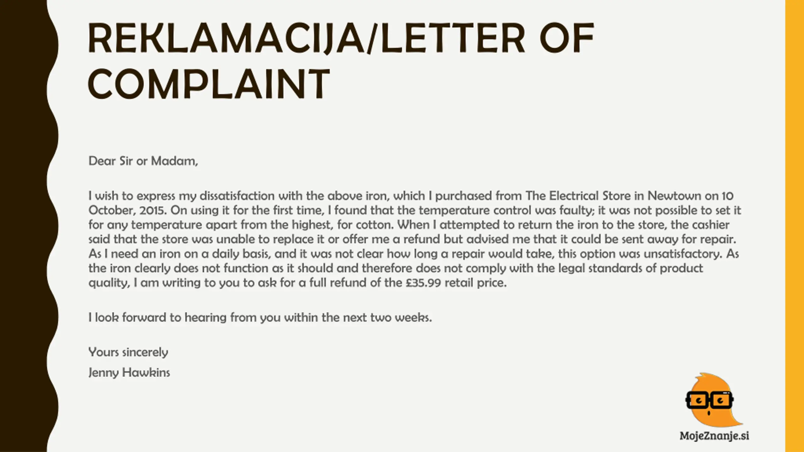 REKLAMACIJA/LETTER OF COMPLAINT Dear Sir or Madam, I wish to express my dissatisfaction with the above iron, which I purchased from The Electrical Store in Newtown on 10 October, 2015. On using it for the first time, I found that the temperature control was faulty; it was not possible to set it for any temperature apart from the highest, for cotton. When I attempted to return the iron to the store, the cashier said that the store was unable to replace it or offer me a refund but advised me that it could be sent away for repair. As I need an iron on a daily basis, and it was not clear how long a repair would take, this option was unsatisfactory. As the iron clearly does not function as it should and therefore does not comply with the legal standards of product quality, I am writing to you to ask for a full refund of the 35.99 retail price. I look forward to hearing from you within the next two weeks. Yours sincerely Jenny Hawkins