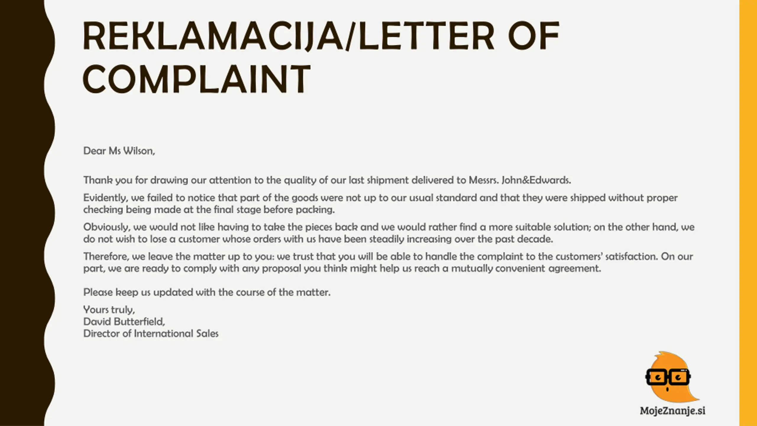 REKLAMACIJA/LETTER OF COMPLAINT Dear Ms Wilson, Thank you for drawing our attention to the quality of our last shipment delivered to Messrs. John&Edwards. Evidently, we failed to notice that part of the goods were not up to our usual standard and that they were shipped without proper checking being made at the final stage before packing. Obviously, we would not like having to take the pieces back and we would rather find a more suitable solution; on the other hand, we do not wish to lose a customer whose orders with us have been steadily increasing over the past decade. Therefore, we leave the matter up to you: we trust that you will be able to handle the complaint to the customers satisfaction. On our part, we are ready to comply with any proposal you think might help us reach a mutually convenient agreement. Please keep us updated with the course of the matter. Yours truly, David Butterfield, Director of International Sales