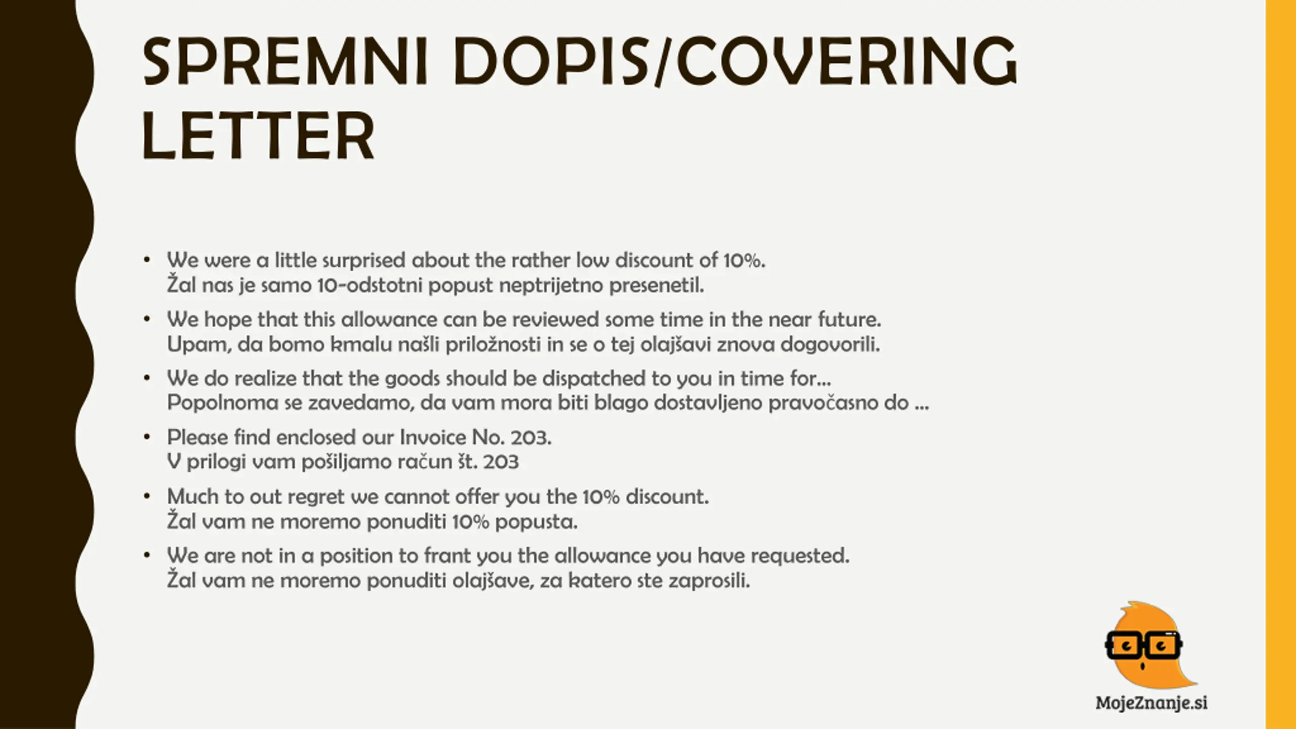 SPREMNI DOPIS/COVERING LETTER We were a little surprised about the rather low discount of 10%. al nas je samo 10-odstotni popust neptrijetno presenetil. We hope that this allowance can be reviewed some time in the near future. Upam, da bomo kmalu na li prilo nosti in se o tej olaj avi znova dogovorili. We do realize that the goods should be dispatched to you in time for Popolnoma se zavedamo, da vam mora biti blago dostavljeno pravo asno do Please find enclosed our Invoice No. 203. V prilogi vam po iljamo ra un t. 203 Much to out regret we cannot offer you the 10% discount. al vam ne moremo ponuditi 10% popusta. We are not in a position to frant you the allowance you have requested. al vam ne moremo ponuditi olaj ave, za katero ste zaprosili.
