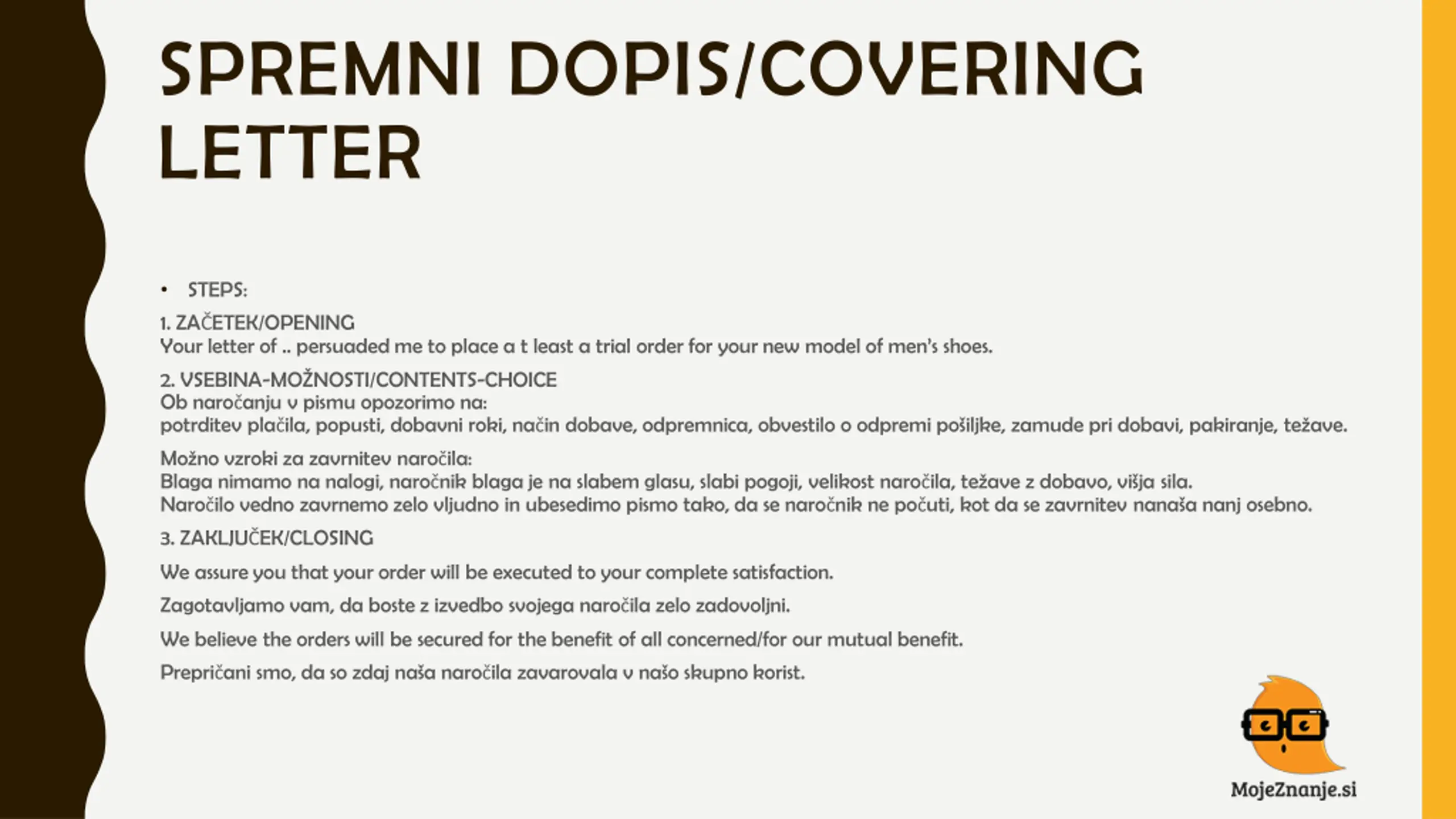 SPREMNI DOPIS/COVERING LETTER 1. ZA ETEK/OPENING Your letter of .. persuaded me to place a t least a trial order for your new model of men s shoes. 2. VSEBINA-MO NOSTI/CONTENTS-CHOICE Ob naro anju v pismu opozorimo na: potrditev pla ila, popusti, dobavni roki, na in dobave, odpremnica, obvestilo o odpremi po iljke, zamude pri dobavi, pakiranje, te ave. Mo no vzroki za zavrnitev naro ila: Blaga nimamo na nalogi, naro nik blaga je na slabem glasu, slabi pogoji, velikost naro ila, te ave z dobavo, vi ja sila. Naro ilo vedno zavrnemo zelo vljudno in ubesedimo pismo tako, da se naro nik ne po uti, kot da se zavrnitev nana a nanj osebno. 3. ZAKLJU EK/CLOSING We assure you that your order will be executed to your complete satisfaction. Zagotavljamo vam, da boste z izvedbo svojega naro ila zelo zadovoljni. We believe the orders will be secured for the benefit of all concerned/for our mutual benefit. Prepri ani smo, da so zdaj na a naro ila zavarovala v na o skupno korist. STEPS: