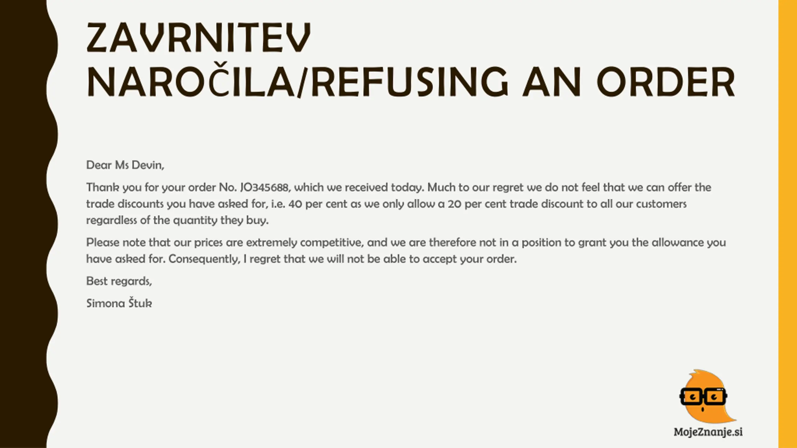 ZAVRNITEV NARO ILA/REFUSING AN ORDER Dear Ms Devin, Thank you for your order No. JO345688, which we received today. Much to our regret we do not feel that we can offer the trade discounts you have asked for, i.e. 40 per cent as we only allow a 20 per cent trade discount to all our customers regardless of the quantity they buy. Please note that our prices are extremely competitive, and we are therefore not in a position to grant you the allowance you have asked for. Consequently, I regret that we will not be able to accept your order. Best regards, Simona tuk