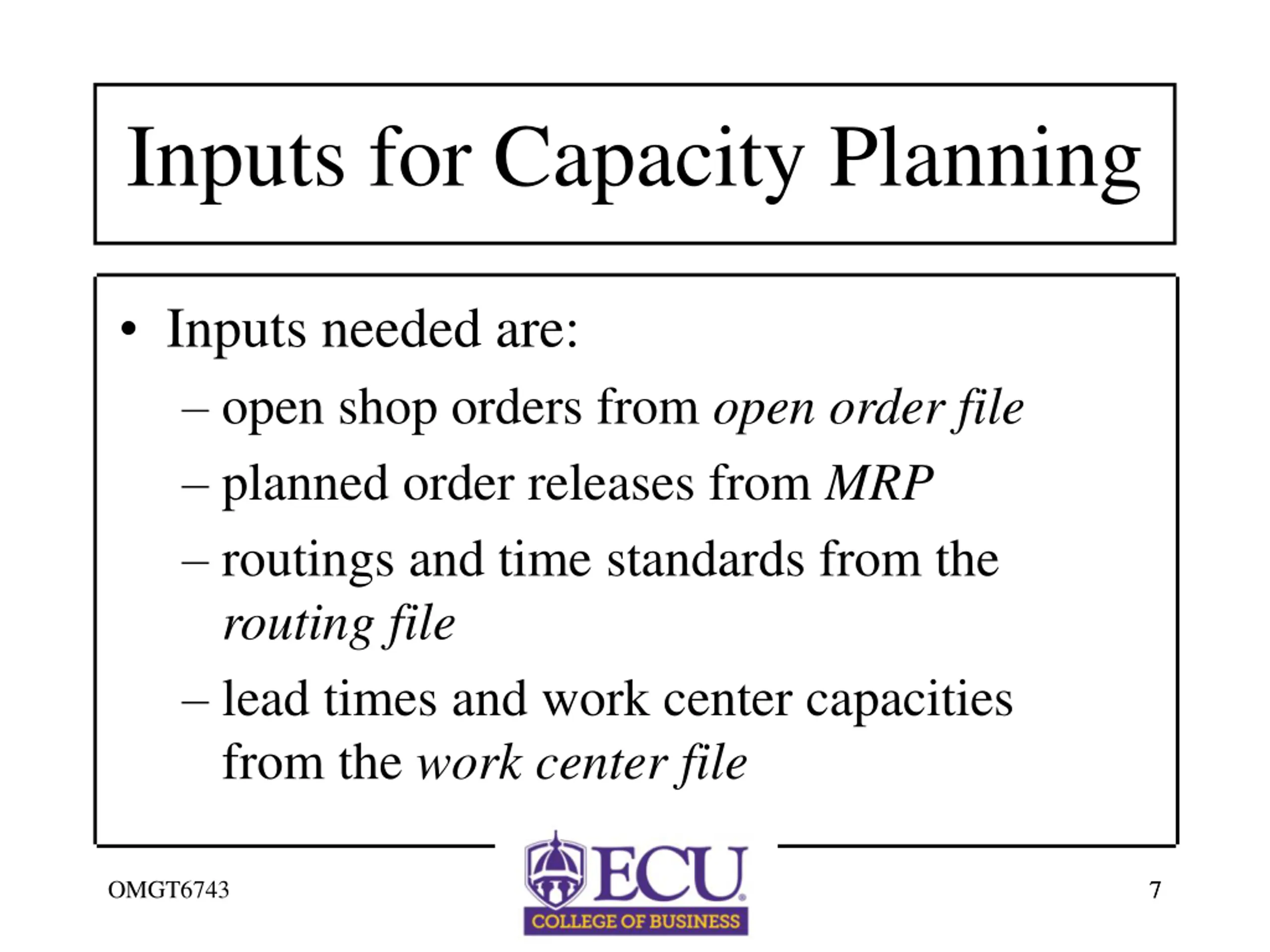 Inputs forCapacity Planning Inputs needed are: open shop orders from open order file planned order releases from MRP routings and time standards from the routing file lead times and work center capacities from the work center file OMGT6743 7 7