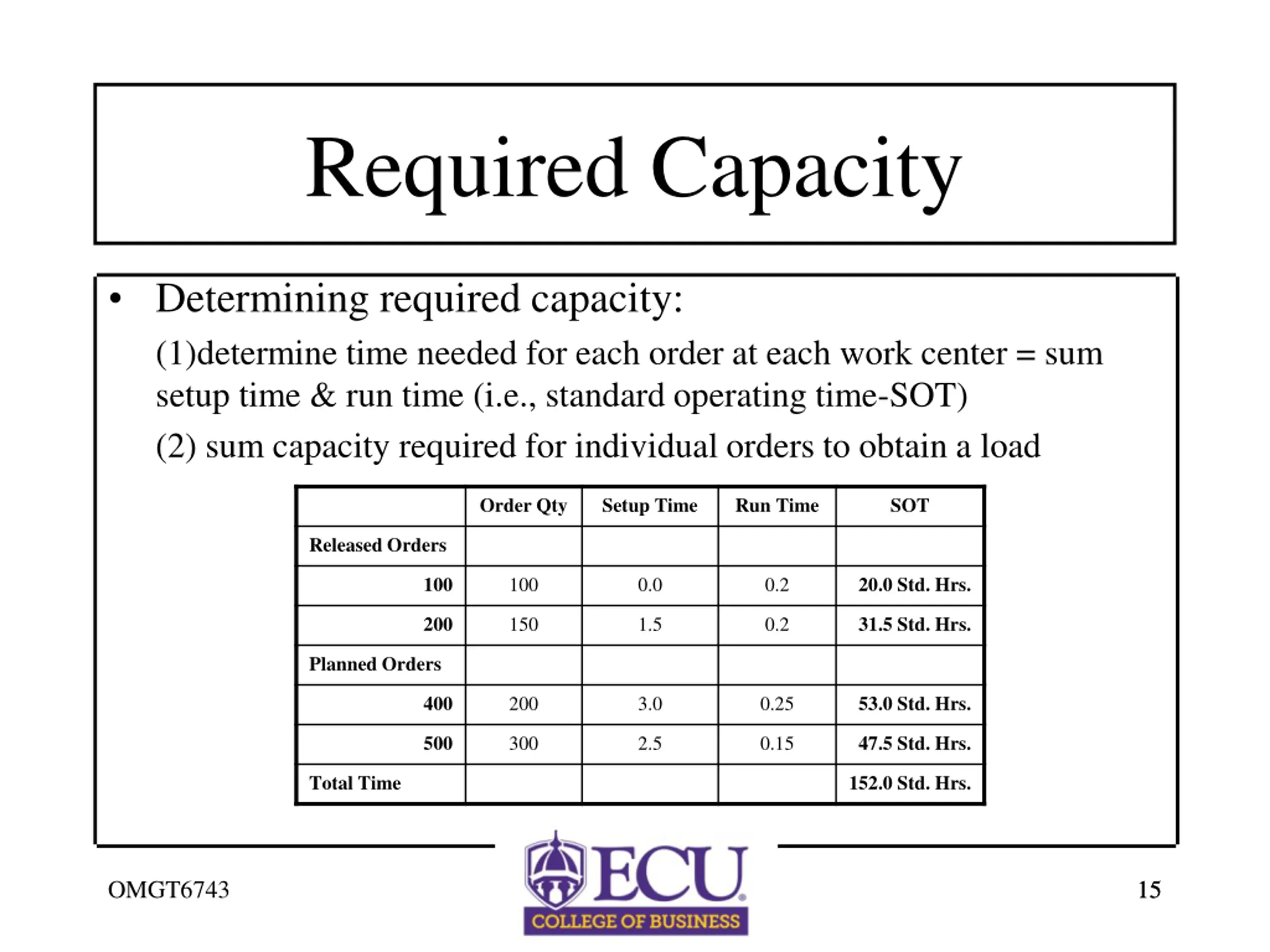 Demonstrated (Measured) Capacity Demonstrated capacity= proven capacity calculated from actual performance data (i.e., average capacity) e.g., Over the previous four weeks, a work center produced 110, 140, 120, & 130 standard hours of work. What is the demonstrated capacity? OMGT6743 14 14