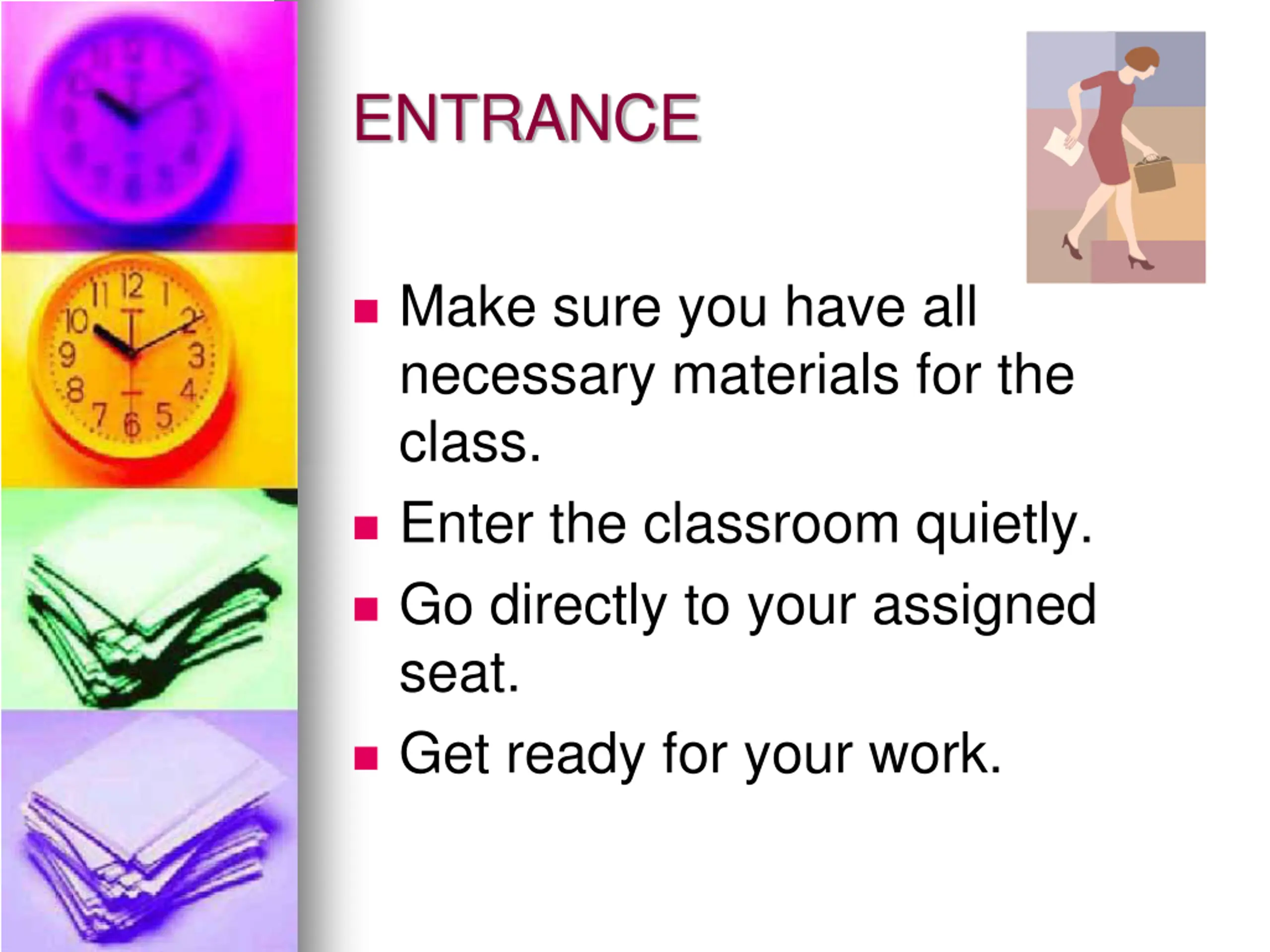 ENTRANCE Make sure you have all necessary materials for the class. Enter the classroom quietly. Go directly to your assigned seat. Get ready for your work.
