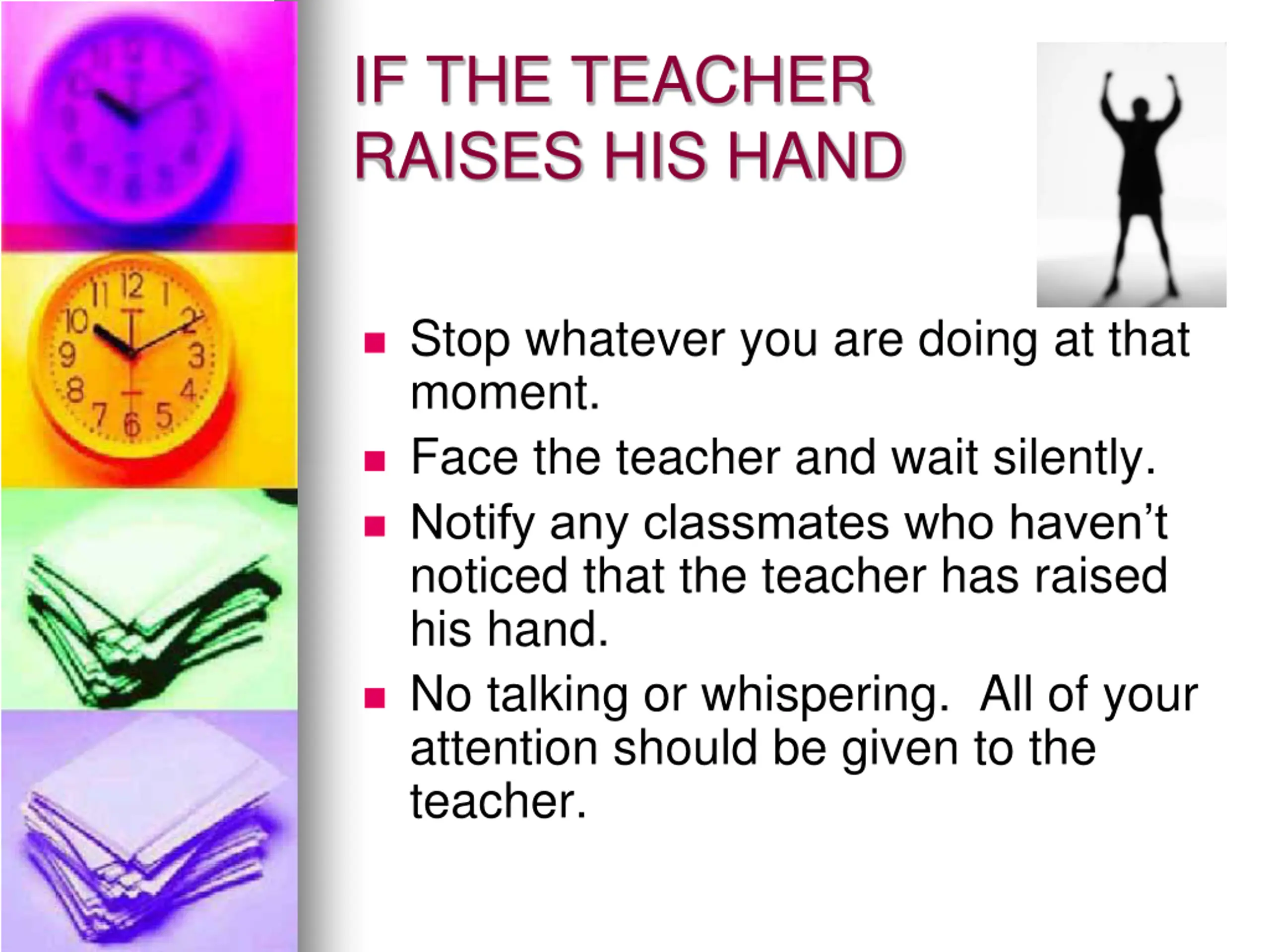 IF THE TEACHER RAISES HIS HAND Stop whatever you are doing at that moment. Face the teacher and wait silently. Notify any classmates who haven t noticed that the teacher has raised his hand. No talking or whispering. All of your attention should be given to the teacher.