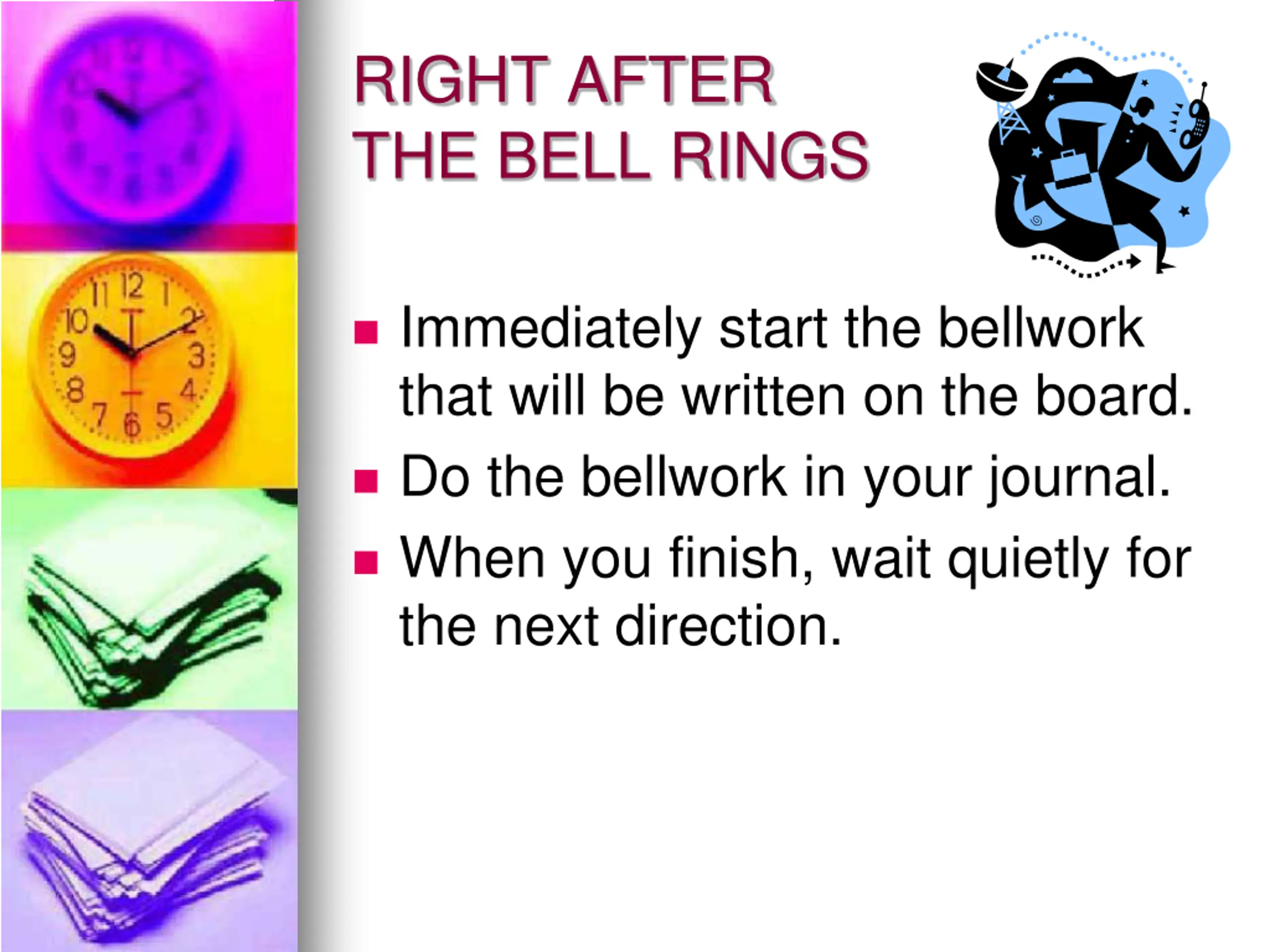 RIGHT AFTER THE BELL RINGS Immediately start the bellwork that will be written on the board. Do the bellwork in your journal. When you finish, wait quietly for the next direction.