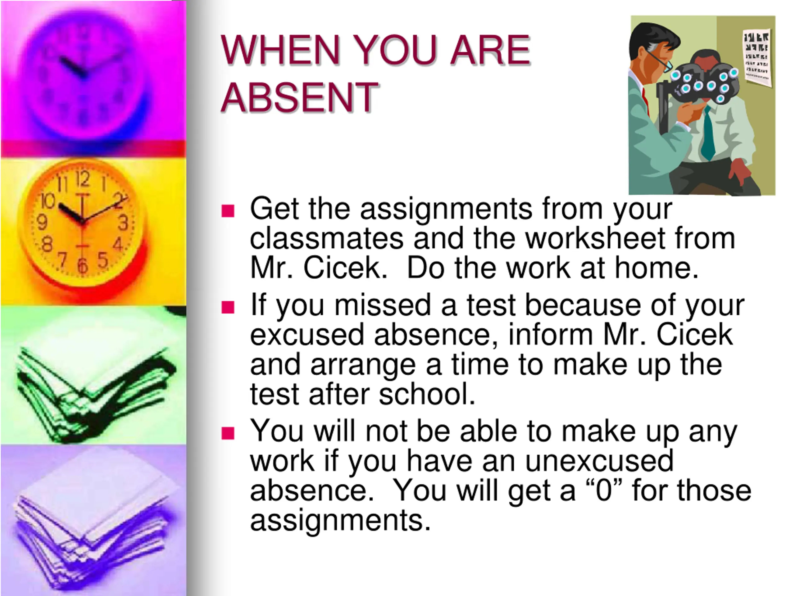 WHEN YOU ARE ABSENT Get the assignments from your classmates and the worksheet from Mr. Cicek. Do the work at home. If you missed a test because of your excused absence, inform Mr. Cicek and arrange a time to make up the test after school. You will not be able to make up any work if you have an unexcused absence. You will get a 0 for those assignments.