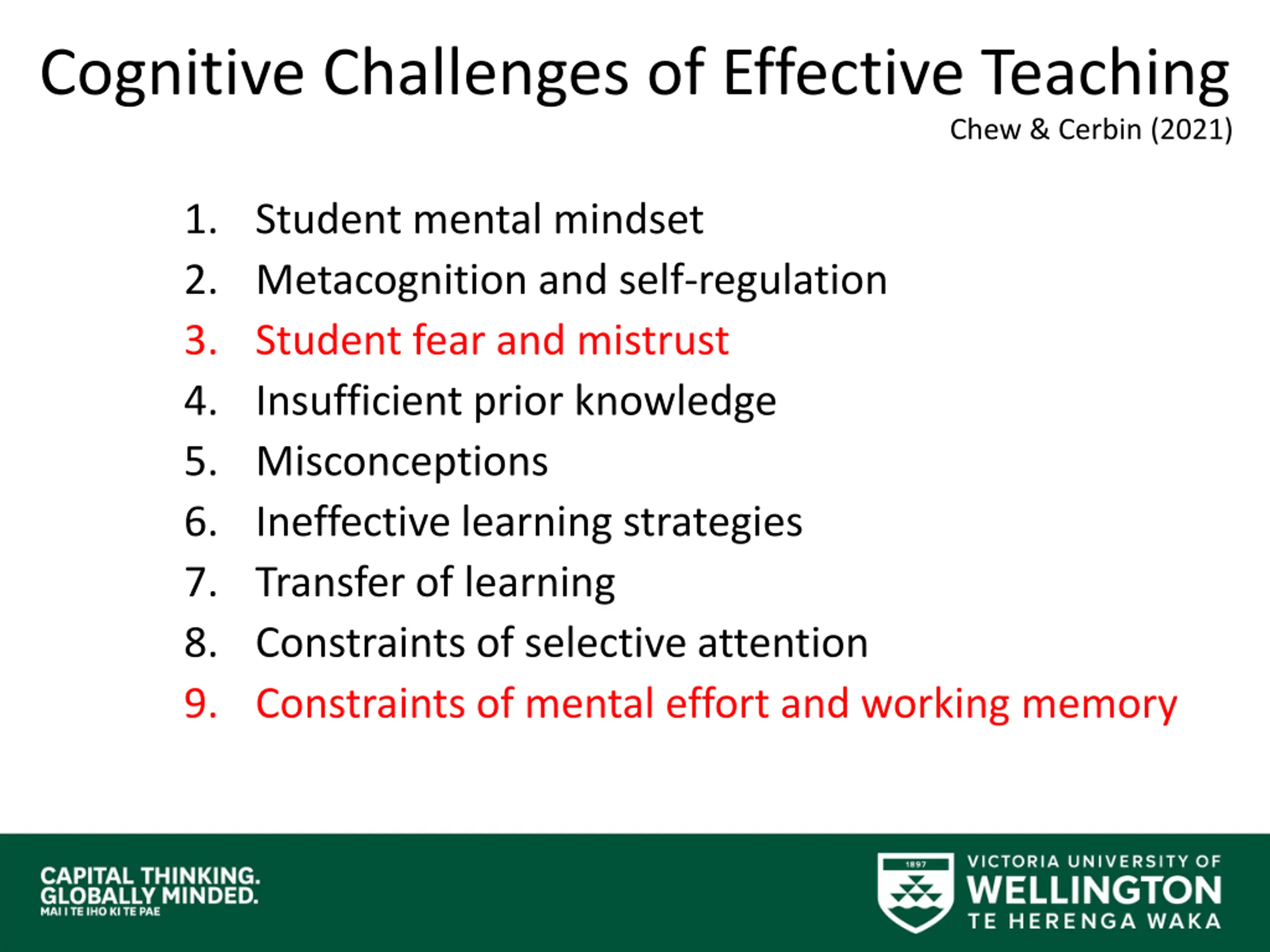 Cognitive Challenges of Effective Teaching Chew & Cerbin (2021) 1. Student mental mindset 2. Metacognition and self-regulation 3. Student fear and mistrust 4. Insufficient prior knowledge 5. Misconceptions 6. Ineffective learning strategies 7. Transfer of learning 8. Constraints of selective attention 9. Constraints of mental effort and working memory