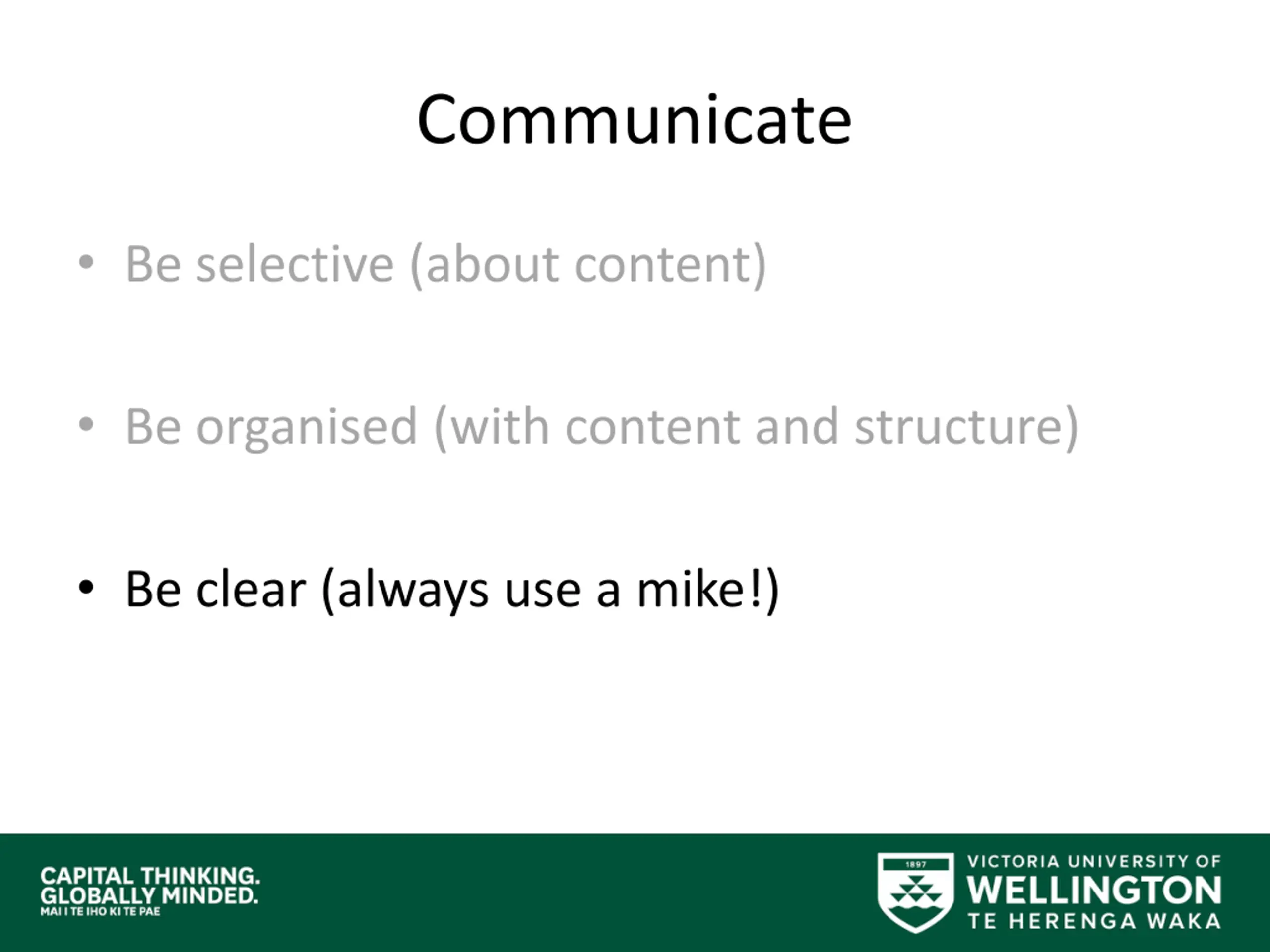 Communicate Be selective (about content) Be organised (with content and structure) Be clear (always use a mike!)