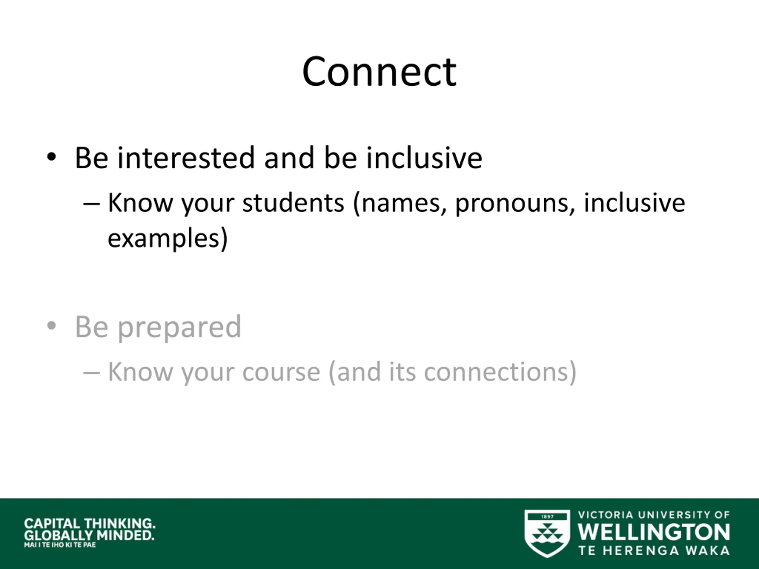 Connect Be interested and be inclusive Know your students (names, pronouns, inclusive examples) Be prepared Know your course (and its connections)