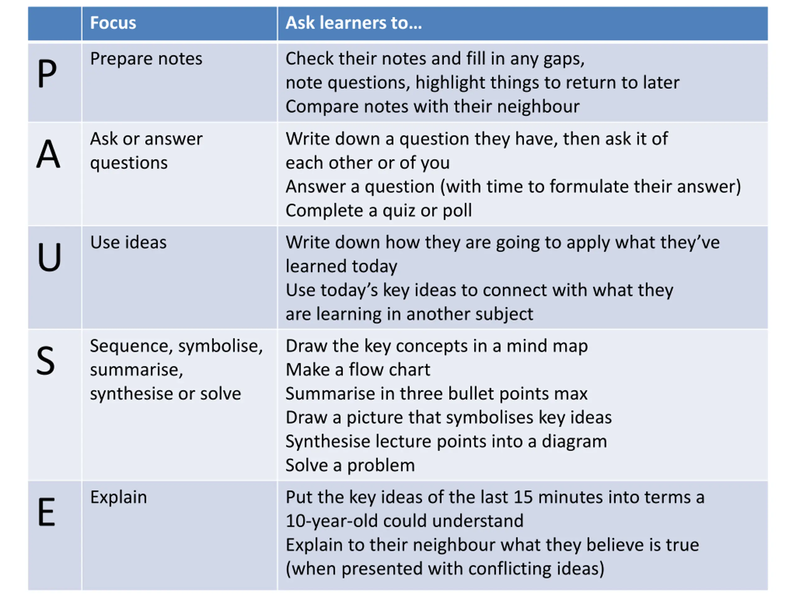 Focus Ask learners to Prepare notes Check their notes and fill in any gaps, note questions, highlight things to return to later Compare notes with their neighbour P Ask or answer questions Write down a question they have, then ask it of each other or of you Answer a question (with time to formulate their answer) Complete a quiz or poll A Use ideas Write down how they are going to apply what they ve learned today Use today s key ideas to connect with what they are learning in another subject U Sequence, symbolise, summarise, synthesise or solve Draw the key concepts in a mind map Make a flow chart Summarise in three bullet points max Draw a picture that symbolises key ideas Synthesise lecture points into a diagram Solve a problem S Explain Put the key ideas of the last 15 minutes into terms a 10-year-old could understand Explain to their neighbour what they believe is true (when presented with conflicting ideas) E