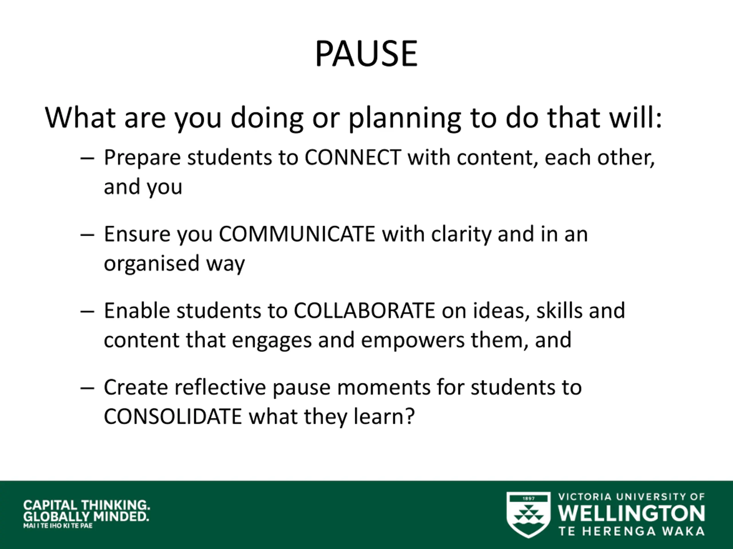PAUSE What are you doing or planning to do that will: Prepare students to CONNECT with content, each other, and you Ensure you COMMUNICATE with clarity and in an organised way Enable students to COLLABORATE on ideas, skills and content that engages and empowers them, and Create reflective pause moments for students to CONSOLIDATE what they learn?