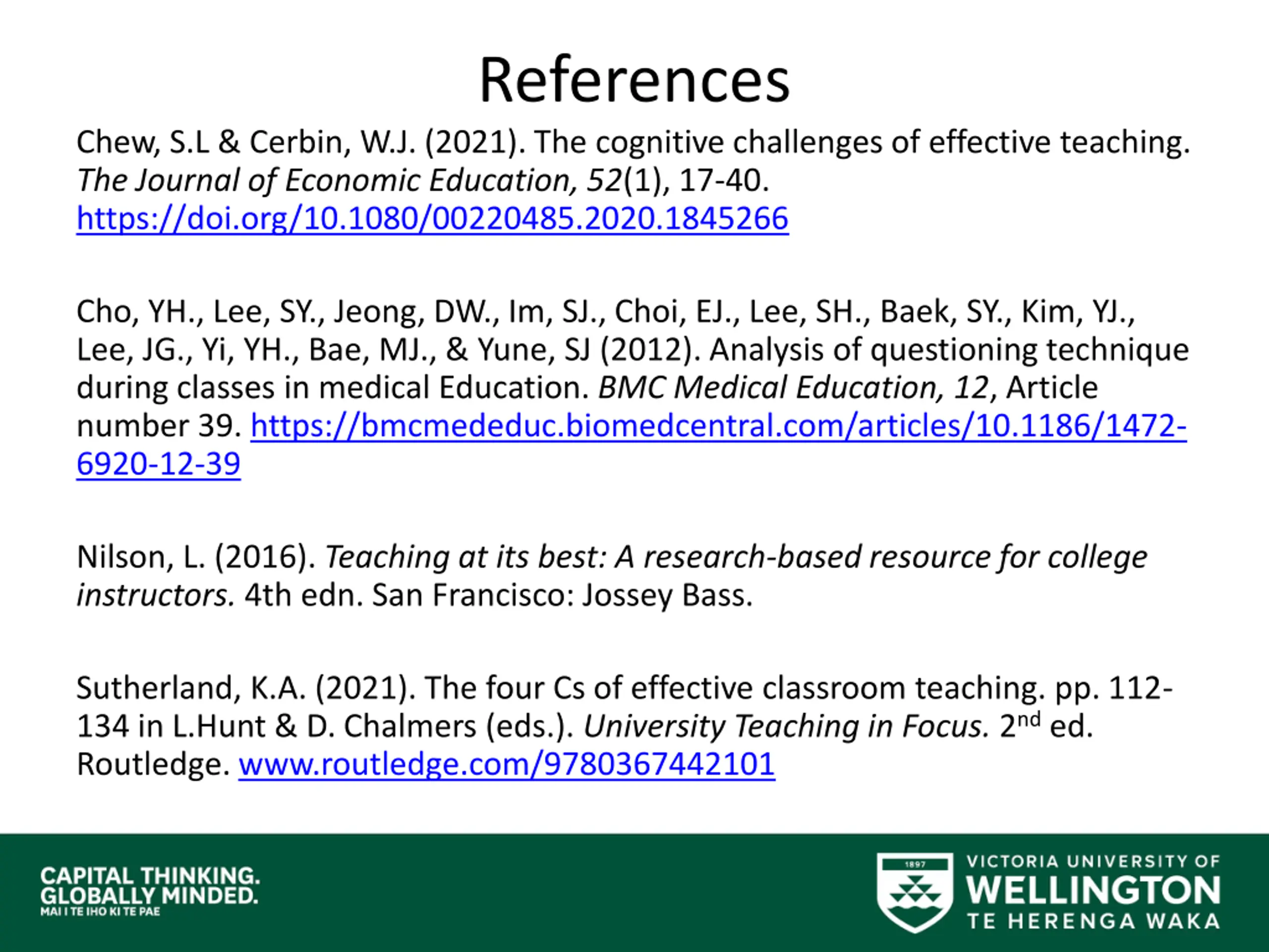 References Chew, S.L & Cerbin, W.J. (2021). The cognitive challenges of effective teaching. The Journal of Economic Education, 52(1), 17-40. https://doi.org/10.1080/00220485.2020.1845266 Cho, YH., Lee, SY., Jeong, DW., Im, SJ., Choi, EJ., Lee, SH., Baek, SY., Kim, YJ., Lee, JG., Yi, YH., Bae, MJ., & Yune, SJ (2012). Analysis of questioning technique during classes in medical Education. BMC Medical Education, 12, Article number 39. https://bmcmededuc.biomedcentral.com/articles/10.1186/1472- 6920-12-39 Nilson, L. (2016). Teaching at its best: A research-based resource for college instructors. 4th edn. San Francisco: Jossey Bass. Sutherland, K.A. (2021). The four Cs of effective classroom teaching. pp. 112- 134 in L.Hunt & D. Chalmers (eds.). University Teaching in Focus. 2nd ed. Routledge. www.routledge.com/9780367442101