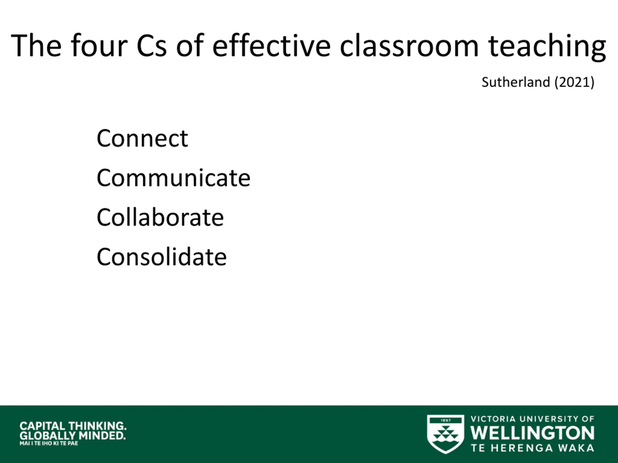 The four Cs of effective classroom teaching Sutherland (2021) Connect Communicate Collaborate Consolidate