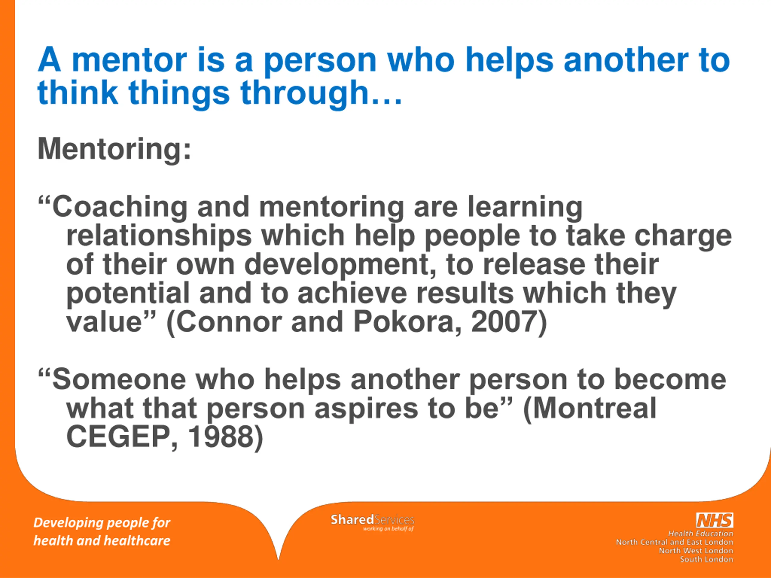 A mentor is a person who helps another to think things through Mentoring: Coaching and mentoring are learning relationships which help people to take charge of their own development, to release their potential and to achieve results which they value (Connor and Pokora, 2007) Someone who helps another person to become what that person aspires to be (Montreal CEGEP, 1988) Developing people for health and healthcare working on behalf of