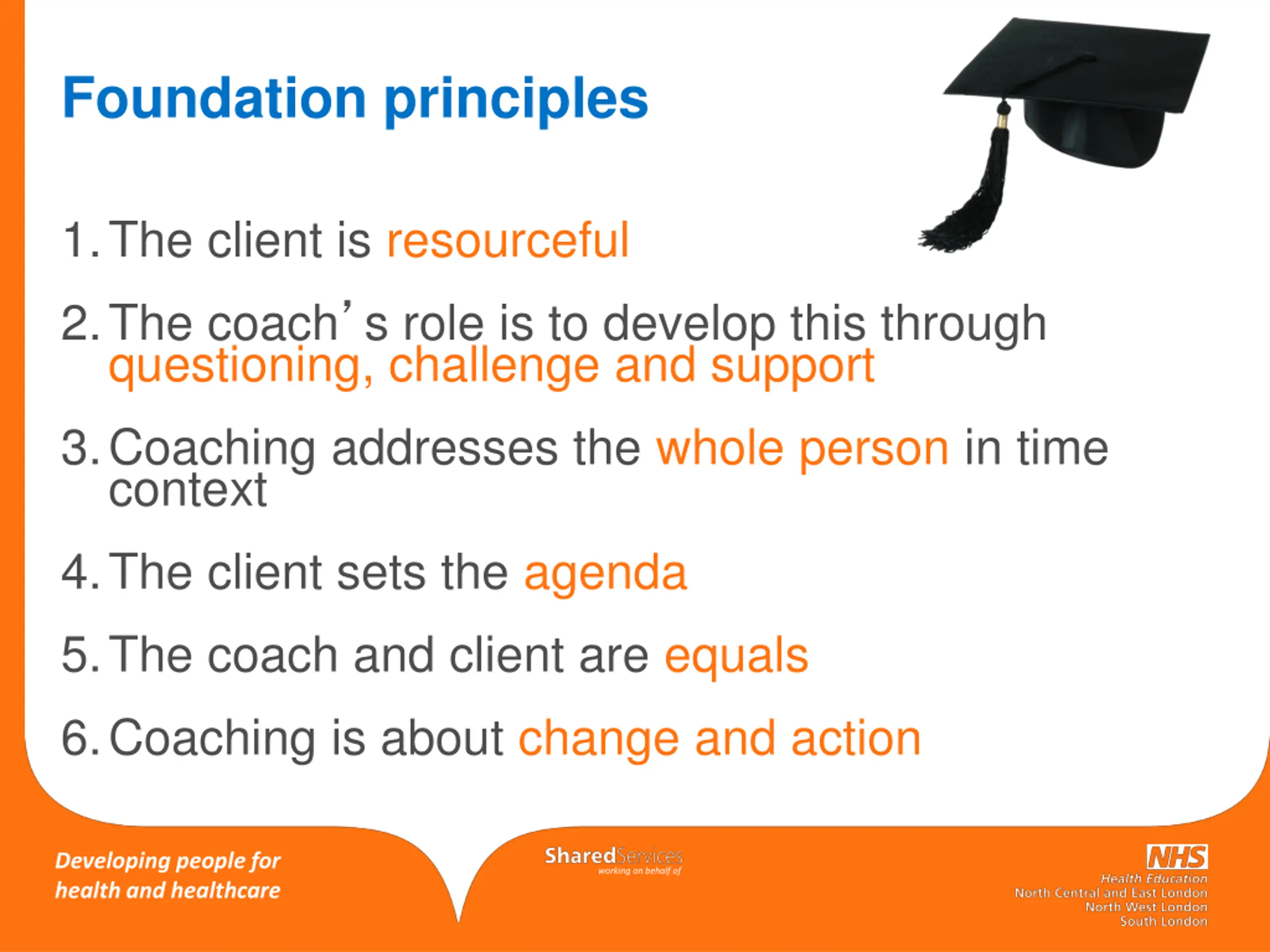 Foundation principles 1.The client is resourceful 2.The coach s role is to develop this through questioning, challenge and support 3.Coaching addresses the whole person in time context 4.The client sets the agenda 5.The coach and client are equals 6.Coaching is about change and action Developing people for health and healthcare working on behalf of
