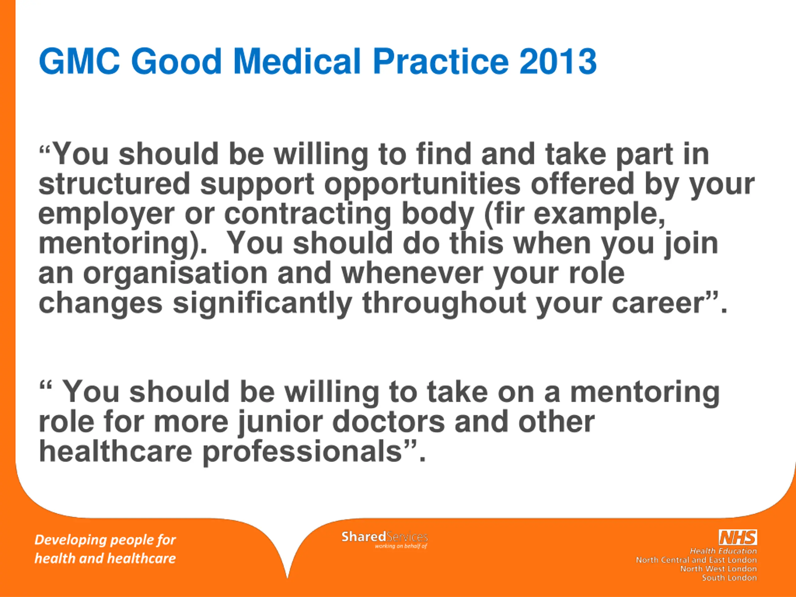 GMC Good Medical Practice 2013 You should be willing to find and take part in structured support opportunities offered by your employer or contracting body (fir example, mentoring). You should do this when you join an organisation and whenever your role changes significantly throughout your career . You should be willing to take on a mentoring role for more junior doctors and other healthcare professionals . Developing people for health and healthcare working on behalf of