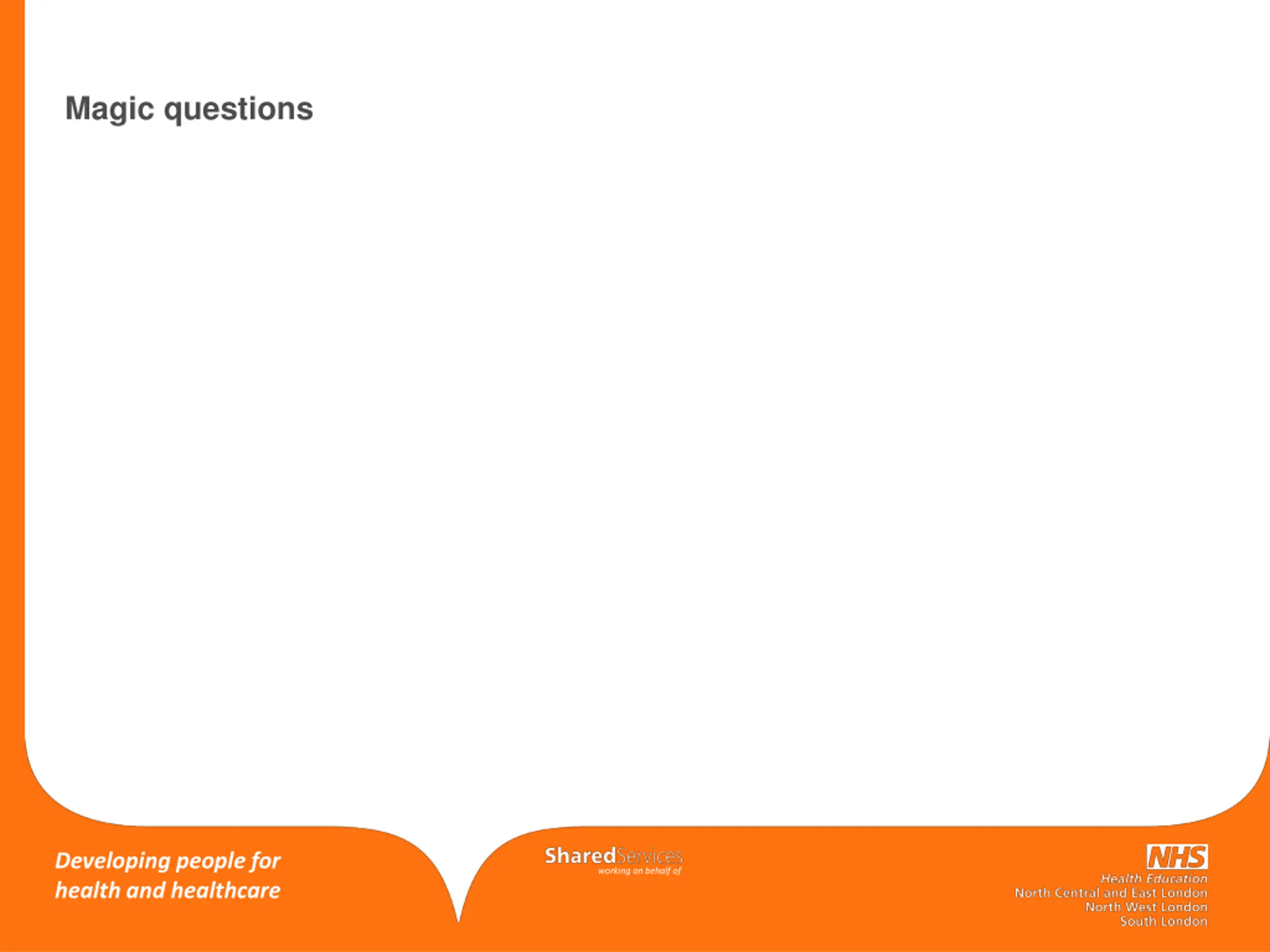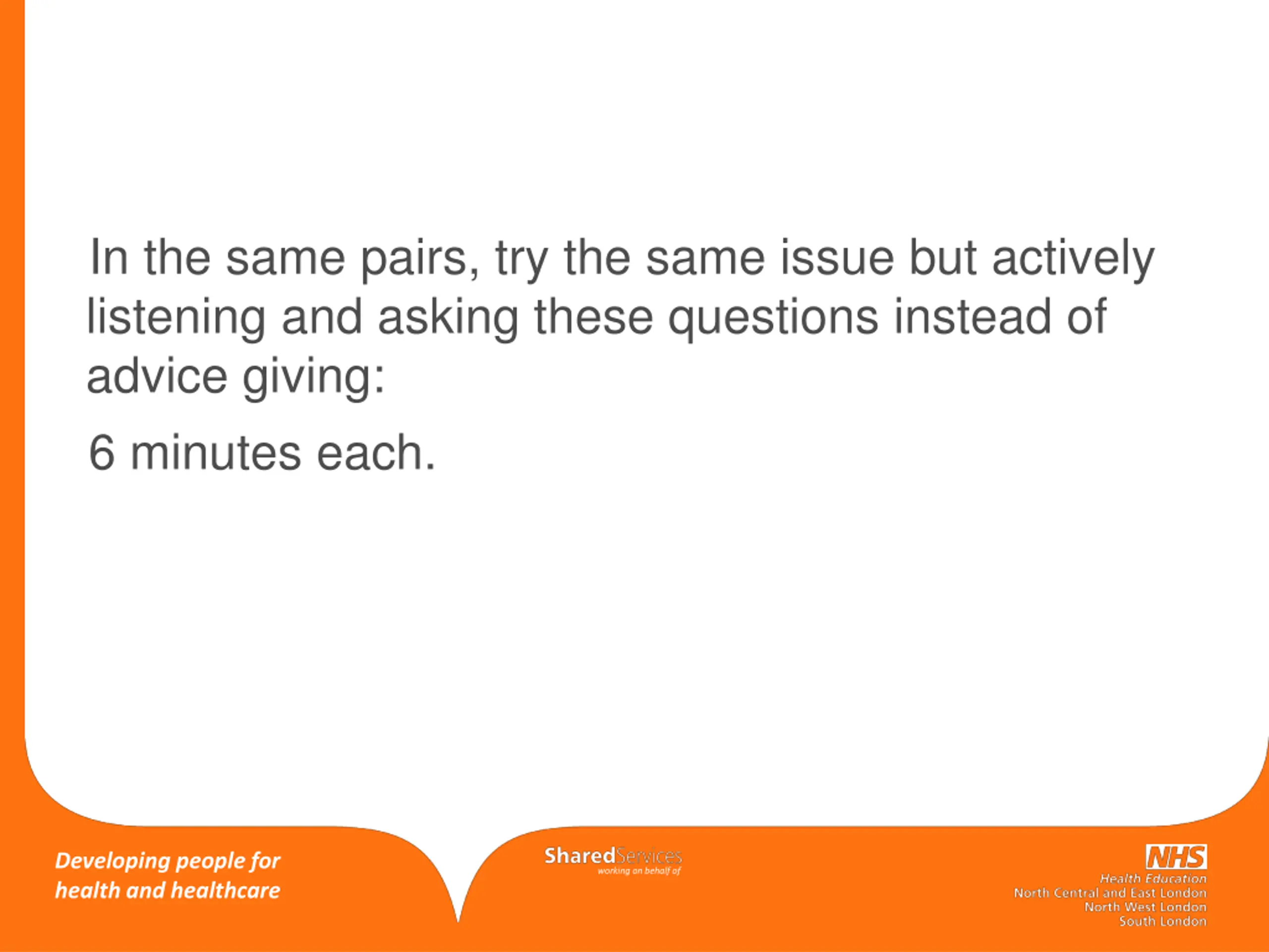 In the same pairs, try the same issue but actively listening and asking these questions instead of advice giving: 6 minutes each. Developing people for health and healthcare working on behalf of