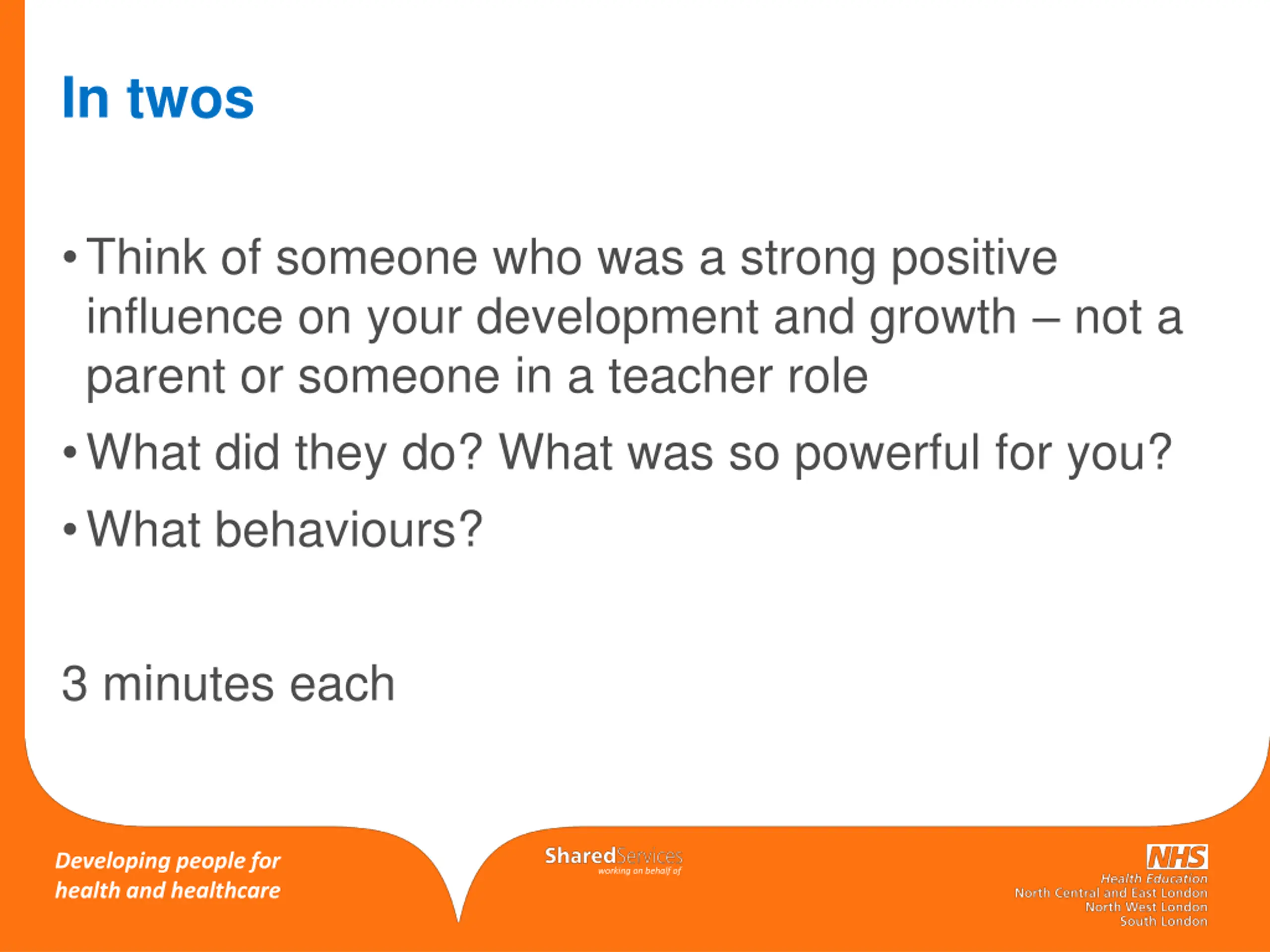 In twos Think of someone who was a strong positive influence on your development and growth not a parent or someone in a teacher role What did they do? What was so powerful for you? What behaviours? 3 minutes each Developing people for health and healthcare working on behalf of