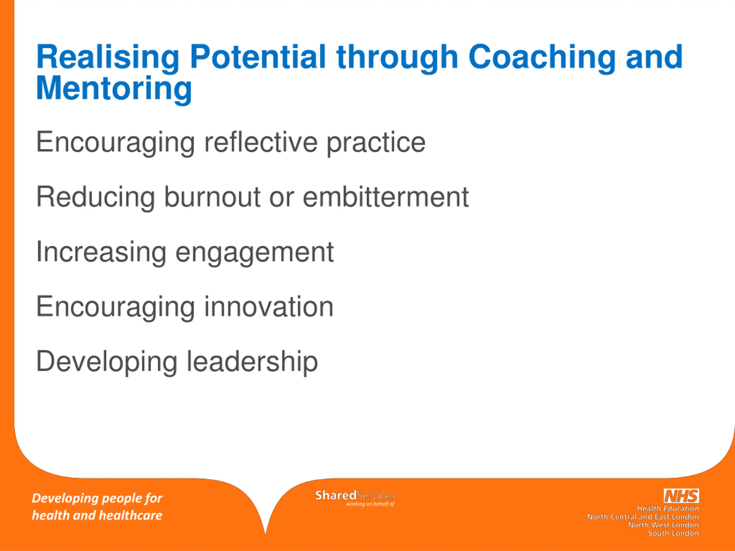 Realising Potential through Coaching and Mentoring Encouraging reflective practice Reducing burnout or embitterment Increasing engagement Encouraging innovation Developing leadership Developing people for health and healthcare working on behalf of