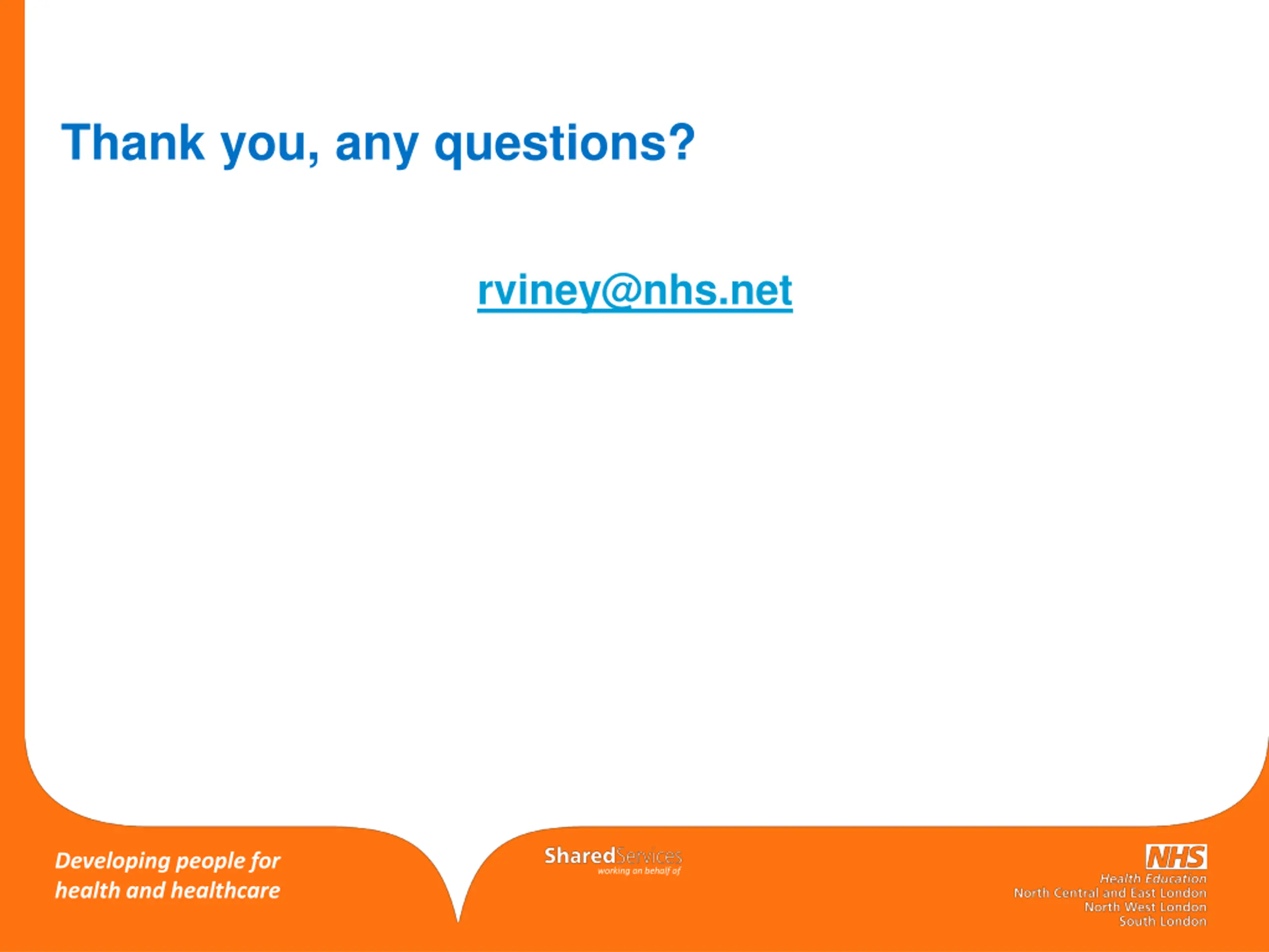 Thank you, any questions? rviney@nhs.net Developing people for health and healthcare working on behalf of