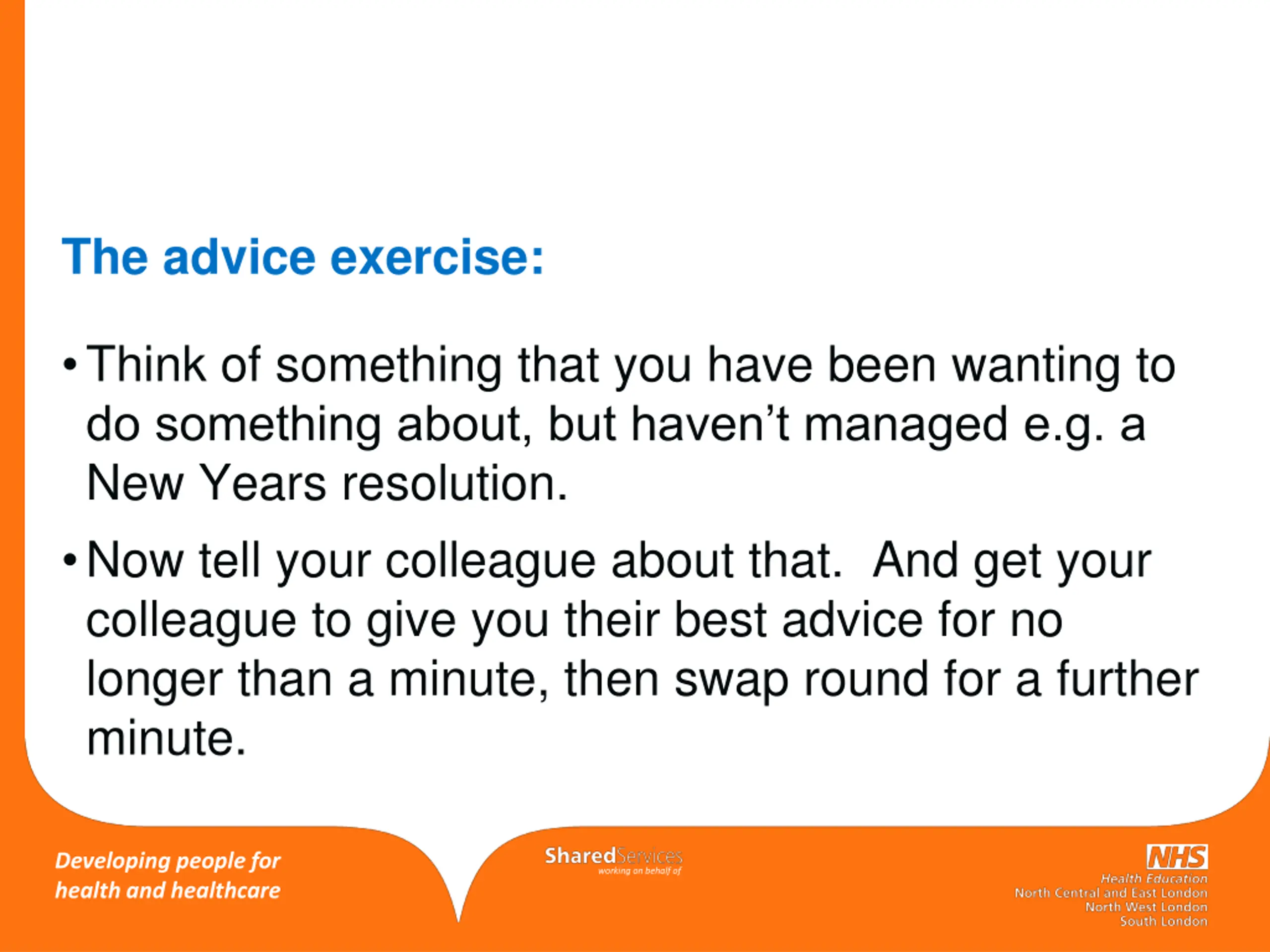 The advice exercise: Think of something that you have been wanting to do something about, but haven t managed e.g. a New Years resolution. Now tell your colleague about that. And get your colleague to give you their best advice for no longer than a minute, then swap round for a further minute. Developing people for health and healthcare working on behalf of